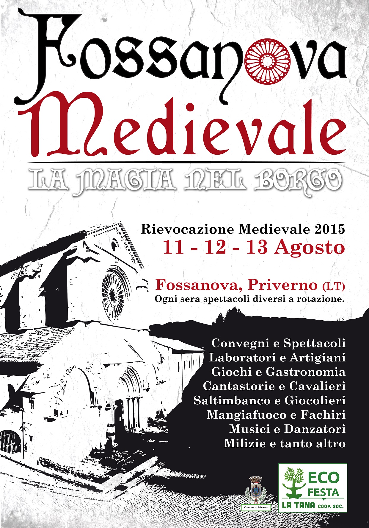 L’11, 12 e 13 giugno 2015 le stradine e le viuzze del Borgo di Fossanova (Priverno, provincia di Latina) si riempiranno di musici e cantori, giocolieri, giullari e saltimbanchi, artigiani e nobili guerrieri. Torna l’appuntamento con Fossanova Medievale, Festival di rievocazione Medievale e tra gli eventi della provincia di Latina più attesi e partecipati. La manifestazione, arrivata alla sua 20^ edizione, sarà organizzata dall’Associazione temporanea di scopo Fossanova Medievale, che vede come Ente capofila la Cooperativa Sociale “La Tana”. ” La Tana” cooperativa sociale apporta a questo festival uno staff di professionisti di comunicazione e progettazione di eventi green, garantendo stoviglie compostabili, gestione dei rifiuti e raccolta differenziata in chiave medievale, tocchi creativi tra le vie magiche del Borgo per permettere all’utente di essere accolto e stupito da un nuovo, vestito di antico, modo di fare eventi e festival nel pieno rispetto dell’ambiente.