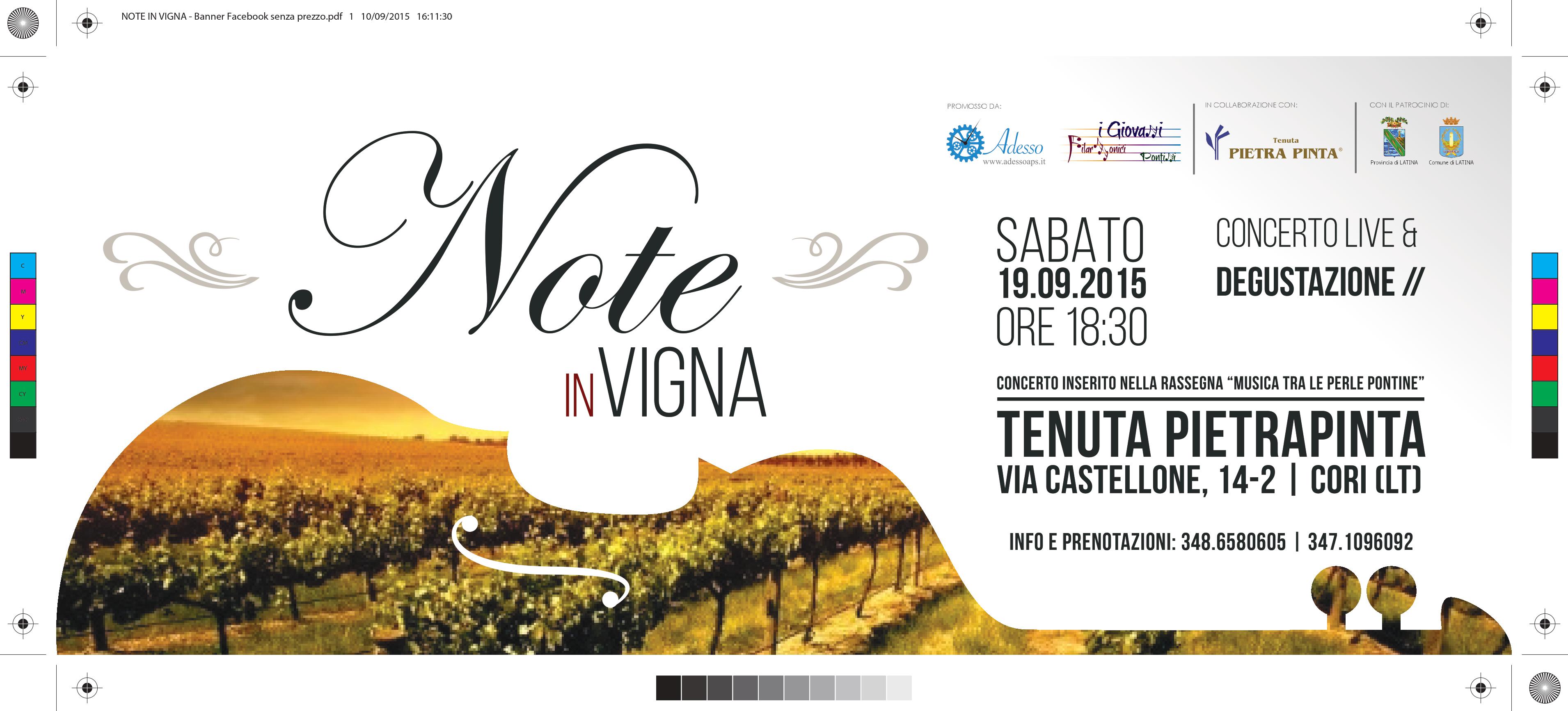 Odori, sapori e suoni in un evento unico capace di stimolare (in) tutti i sensi. Dopo aver attraversato alcuni dei luoghi più belli della provincia di Latina, la rassegna concertistica ‘Musica tra le Perle Pontine’ fa tappa nella Città d’Arte con ‘Note in Vigna’. Il concerto filarmonico & degustazione, promosso dall’Associazione ‘Adesso APS’, col patrocinio della Provincia e del Comune di Latina, si terrà sabato 19 Settembre 2015, dalle ore 18:30, nella splendida cornice della Tenuta Pietra Pinta, in via Castellone 14-2 – Cori (LT).Protagonisti della kermesse itinerante sono i ‘Giovani Filarmonici Pontini’ diretti dal M° Stefania Cimino, affermata realtà del panorama musicale laziale, con all’attivo numerosi concerti, prestigiose collaborazioni, importanti riconoscimenti e lusinghieri apprezzamenti da parte di critica e pubblico. A Cori il gruppo si presenterà con una ventina dei suoi trenta effettivi, ragazze e ragazzi tra i 14 e 30