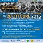 Venerdì 28 ottobre presso la facoltà di Economia e Ingegneria, la città di Latina si preparerà ad accogliere molte figure importanti per lo sviluppo sostenibile del territorio. Oltre l’amministrazione comunale, ci sarà il mondo accademico della ricerca e le associazioni di categoria i quali si incontrano per individuare concrete soluzioni per lo sviluppo del territorio, si cercherà un confronto anche per quel che riguarda le sfide poste dei cambiamenti climatici. La “maratona culturale” per il Clima del capoluogo pontino, dal titolo “GOL: Green Opportunities in Latina, è organizzata dall’associazione Sempre verde pro natura, insieme ad altre realtà del territorio e i patrocini del comune di Latina, Aprilia e Potinia. La giornata si aprirà con una conferenza plenaria delle 8.30, si procederà con gli interventi della comunità scientifica e delle istituzioni. Alle 14, presso le aule studio della facoltà di Ingegneria, si apriranno i lavori dei tavoli tecnici tematici, otto in tutto, per la produzione di idee innovative per il clima per poi procedere con la presentazione alla plenaria delle idee sviluppate dai tavoli. Successivamente intorno le 18:30, ci sarà la dichiarazione dell’idea vincente e l’inaugurazione della mostra “ L’arte per il clima”. “Sono onorato che Latina sia tra le 59 città del mondo che partecipano all’evento – ha affermato il sindaco Damiano Coletta – e l’adesione alla campagna è coerente con l’attenzione che l’amministrazione riserva al tema dell’ambiente e dà la misura del grande lavoro svolto dalle associazioni sul territorio essendo state proprio le associazioni ad aver organizzato e messo a punto l’iniziativa”.