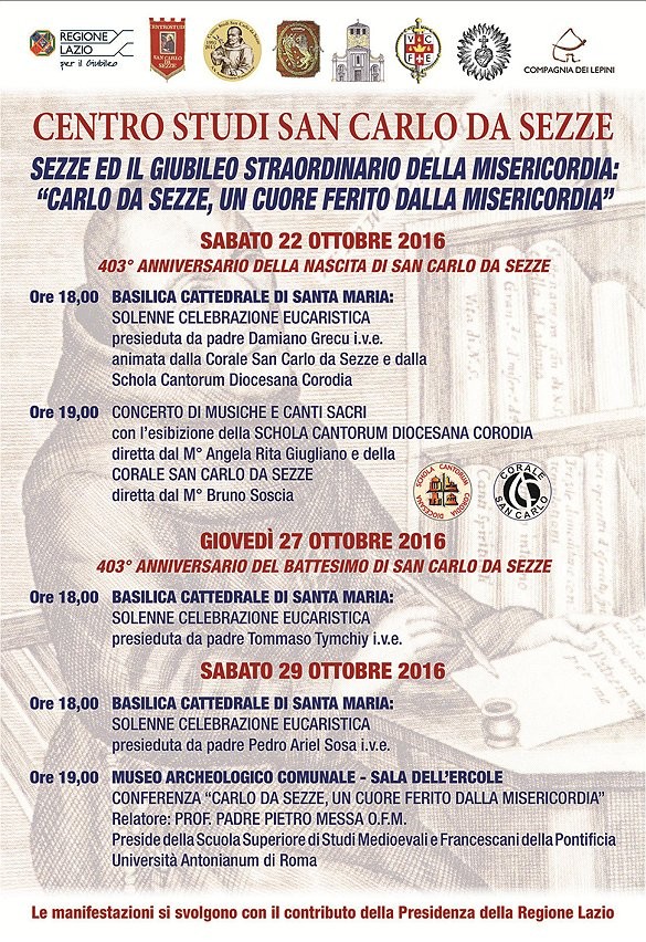 Nell’ambito del Giubileo Straordinario della Misericordia, il Centro Studi San Carlo da Sezze ha organizzato una manifestazione che si svilupperà in tre eventi distribuiti in una settimana. Si inizia sabato 22 ottobre nella Basilica Cattedrale di Santa Maria, dove alle 18 si terrà la solenne celebrazione eucaristica presieduta da padre Damiano Grecu, animata dalla Corale San Carlo da Sezze e dalla Schola Cantorum Diocesana Corodia. A seguire, alle 19, si terrà un concerto di musiche e canti sacri con l’esibizione della Corale San Carlo da Sezze diretta dal Maestro Bruno Soscia e dalla Schola Cantorum Diocesana Corodia diretta dalla Maestra Angela Rita Giugliano. Giovedì 27 ottobre, sempre a Santa Maria alle 18, si terrà una solenne celebrazione eucaristica presieduta da padre Tommaso Tymchiy. Sabato 29 ottobre una solenne celebrazione eucaristica presieduta da padre Pedro Ariel Sosa. A seguire, alle 19 nella Sala dell’ Ercole del Museo Archeologico, si terrà la conferenza “Carlo da Sezze, un cuore ferito dalla Misericordia”. Relatore il professor Padre Pietro Messa, preside della Scuola Superiore di Studi Medioevali e Francescani della Pontificia Università Antonianum di Roma. La manifestazione, che verterà sulla figura di uno dei Santi Patroni della città di Sezze (insieme a San Lidano), a ridosso del 403esimo anniversario della sua nascita, ha avuto il patrocinio della Presidenza della Regione Lazio ed è organizzata dal Centro Studio San Carlo da Sezze in collaborazione, oltre che del Comune di Sezze, della Basilica Cattedrale di Santa Maria, dell’Istituto del Verbo Incarnato, della Compagnia dei Lepini e della Confraternita del Santissimo Cuore di Gesù detta dei “Sacconi”.