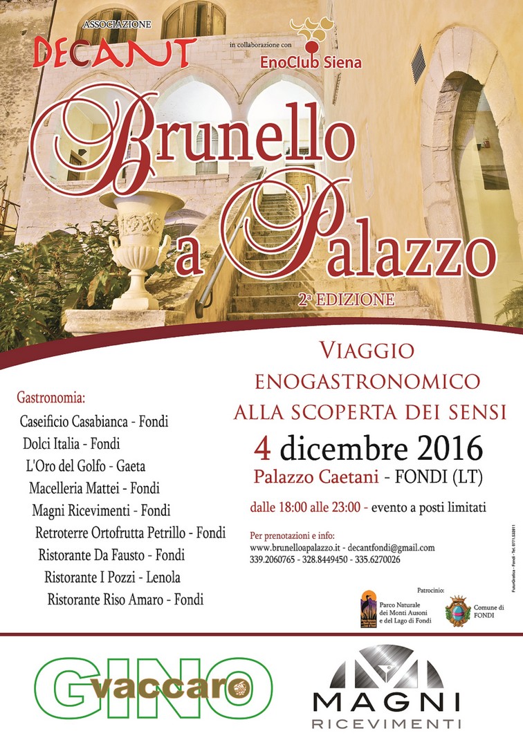 Gli amici dell’associazione Decant sono a lavoro per la seconda edizione di “Brunello a Palazzo”, l’evento enogastronomico realizzato in collaborazione con l’Enoclub Siena. L’appuntamento in agenda è per il 4 dicembre dalle ore 18,00 alle ore 23 nella splendida e storica cornice di Palazzo Caetani, già sede e dimora di Giulia Gonzaga, illustre figura femminile a cui la Città di Fondi è particolarmente legata da secoli. A rendere più conviviale la serata, con la sua pluriennale esperienza in fatto di Brunello, ci penserà con la sua sapiente regia Davide Bonucci, che fin dall’inizio ha creduto nel “Viaggio enogastronomico alla scoperta dei sensi” iniziato da Decant e che presenterà le Aziende vitivinicole provenienti dalla Val d’Orcia. A sostenere il Principe dei vini Italiani e ad esaltare i sapori della Piana di Fondi, ancora una volta, i migliori ristoratori ed operatori locali come: Caseificio Casabianca (Fondi), Dolci Italia (Fondi), L’Oro del Golfo (Gaeta), Macelleria Mattei (Fondi), Magni Ricevimenti (Fondi), Retroterre di Ortofrutta Petrillo (Fondi), Ristorante da Fausto (Fondi), Ristorante I Pozzi (Lenola), Ristorante Riso Amaro (Fondi). Un evento unico nel suo genere, patrocinato sia dal Comune di Fondi che dal Parco Naturale dei Monti Ausoni e del Lago di Fondi. Per info e prenotazioni contattare i numeri telefonici presenti sul sito.