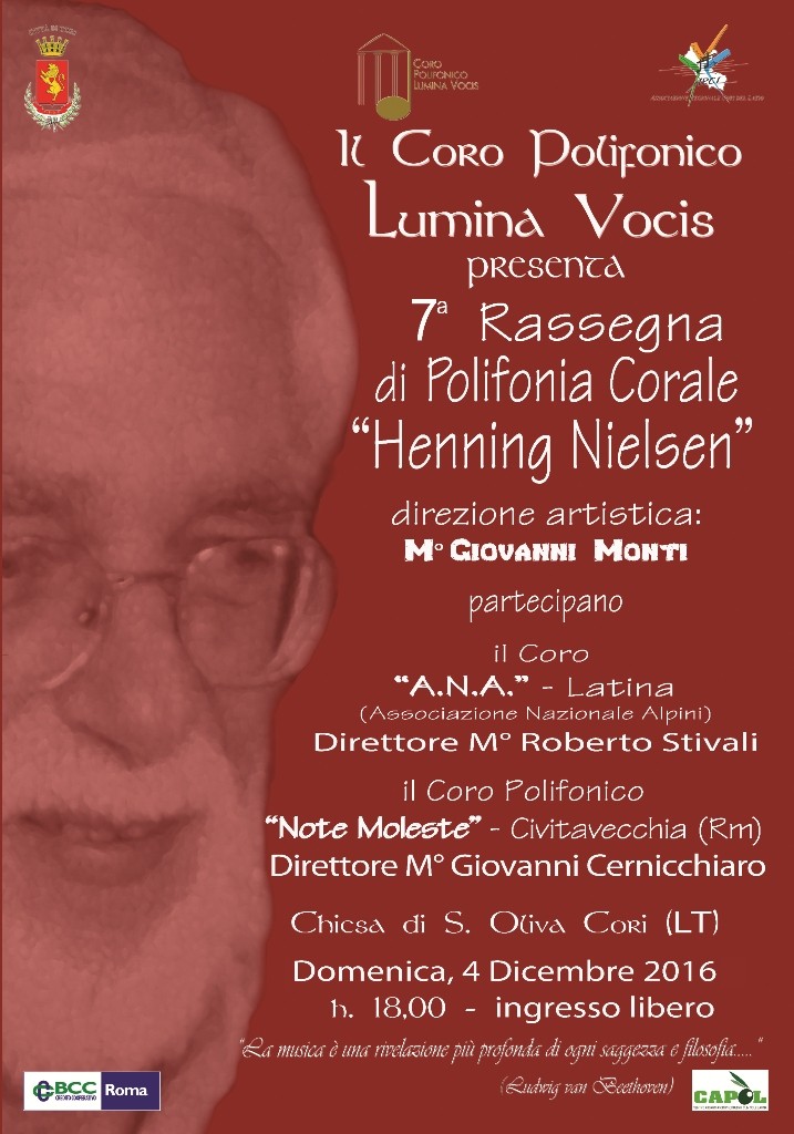 Nell’ambito della manifestazione ‘Cori: dell’Olio e delle Olive’ 2016, domenica 4 Dicembre, alle ore 18, la Chiesa di Sant’Oliva ospiterà la 7^ Rassegna di Polifonia Corale ‘Henning Nielsen’, consueto appuntamento prenatalizio intitolato al tenore danese e cittadino onorario di Cori prematuramente scomparso nell’autunno del 2010. Un momento di incontro tra gruppi corali che hanno in comune la passione per il canto polifonico, il desiderio di analisi e studio di generi musicali antichi, moderni e contemporanei. Henning Nielsen, professore di musicologia all’Università di Arhus, da anni residente a Cori, si era appassionatamente dedicato alla musica corale, esibendosi con il Coro Polifonico Lumina Vocis diretto dal M° Giovanni Monti, giunto all’11° anno di attività e che organizza l’evento con il Patrocinio dell’Associazione Regionale Cori del Lazio e del Comune di Cori, il contributo della BCC di Roma – filiale di Cori ed altri sponsor, nell’ambito della manifestazione ‘Cori: dell’Olio e delle Olive 2016’. Oltre al Coro Polifonico Lumina Vocis di Cori, dalla Cappella del SS. Crocefisso si esibiranno altre due corali. Il Coro A.N.A. di Latina diretto dal M° Roberto Stivali, presenta il proprio originale repertorio, fondato, oltre che su brani della tradizione più classica, su nuove elaborazioni di musiche popolari e su composizioni originali, facendosi promotore dei valori e delle tradizioni culturali dell’Agro Pontino. Il Coro Note Moleste di Civitavecchia (Roma) affidato alla direzione del M° Giovanni Cernicchiaro, è una realtà giovanile composta da una ventina di ragazzi tra i 15 e i 40 anni e propone un repertorio che comprende musica polifonica sacra e profana dal ‘500 ad oggi ed arrangiamenti di musica pop, rock e jazz. L’iniziativa vuole promuovere la polifonia corale amatoriale sacra e profana e trasmettere, attraverso la musica, lo stimolo affinché la cultura, in tutte le sue forme e manifestazioni, sia rivalutata ed incentivata. L’attività musicale corale a carattere non professionale è uno degli elementi che caratterizzano e possono tramandare la tradizione culturale di una comunità nonché i valori storici, artistici, sociali di cui essa è portatrice e che permeano il suo territorio. Si tratta di riconoscerne l’importanza e dotarla del sostegno necessario a salvaguardarne l’enorme potenziale volontaristico.