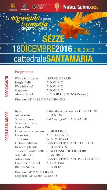 Domenica 18 dicembre, alle ore 20.30, la chiesa cattedrale di Santa Maria farà da cornice al concerto natalizio polifonico “Seguendo la cometa”, giunto alla terza edizione. L’iniziativa, che rientra tra quelle inserite nel cartellone del “Natale Setino” 2016, è organizzata dal Coro InCantu, diretto dal M° Carlo Marchionne. La serata verrà introdotta dal coro InCantu con brani della tradizione natalizia come: White Christmas, Jingle Bells, We Wish You, per lasciare quindi posto alla corale San Marco di Latina diretta dal Maestro Mauro Bassi, uno dei cori più rappresentativi nel quadro della coralità in Italia e tra i più prestigiosi della provincia di Latina. Il coro InCantu nasce nel 2003, proponendo all’inizio brani del repertorio della musica vocale profana del rinascimento italiano e inglese. Pian piano però si è affiancato anche l’interesse per il gospel e la rielaborazione di brani di musica leggera. In questi anni si è esibito in diverse rassegne corali al fianco di altre corali della provincia di Latina. Nel 2004, in occasione della Giornata del Malato, ha animato la Santa Messa in Vaticano alla presenza del Santo Padre papa Giovanni Paolo II. Durante la settimana Santa ha eseguito al Teatro D’Annunzio di Latina e nella cattedrale di Sezze, le “Laude della Passione” dal Laudario Cortonese di Jacopone da Todi. Diretti dal Maestro Antonio Pantaneschi insieme all’Orchestra e Coro Internazionale, ha eseguito nel 2005 la “Messa da Requiem” di G.Verdi nella basilica di San Paolo a Roma, nella chiesa di S. Francesco di Paola a Paola e all’Auditorium M. Costa a Sezze. Nel 2010, per la prima volta ha partecipato, alla rassegna corale “Terra Pontina in Canto” nella Cattedrale di San Marco a Latina nel 2011 ha partecipato alla rassegna CanticUmbria a Trevi (PG). Il Consiglio Comunale di Sezze in occasione dei 150 anni dell’Unità d’Italia ha riconosciuto il coro InCantu quale Gruppo di Musica Popolare e Amatoriale di Interesse Comunale. Il Maestro Carlo Marchionne ha conseguito i diplomi in Flauto traverso e in Flauto Dolce nel Conservatorio O.Respighi di Latina. Nel 2006 ha conseguito il diploma accademico specialistico di II livello laureandosi con il massimo dei voti in Discipline Musicali. Svolge attività concertistica come solista e in formazioni cameristiche insieme ai maestri più rappresentativi nel panorama della musica antica in Europa. Svolge anche attività didattica ed ha insegnato Flauto Dolce nel Conservatorio di Latina in qualità di cultore della materia. Nel 2000 è nato in lui un interesse per la direzione del coro. Dal 2008 al 2010 è stato il direttore del Coro ANA di Latina. La storia della Corale San Marco di Latina è strettamente legata alla cultura dei primi coloni giunti dall’Italia nel 1932, e per la spinta entusiastica del primo parroco di S. Marco don Carlo Torello. Nasce nel 1933 come Corale di Littoria oggi Corale San Marco. Il vasto repertorio e lo spessore artistico delle opere eseguite fanno della corale il punto di riferimento della cultura musicale della provincia di Latina. Ha tenuto concerti in Italia e in tutta Europa. Dal marzo 2000 la Corale San Marco è diretta dal Maestro Mauro Bassi, ampliandone il repertorio e curando lo studio della tecnica vocale e della coralità contemporanea. Organizza nella Cattedrale San Marco, la Rassegna Corale denominata Concerti dell’Avvento, giunta alla XVIIª edizione, a cui partecipano cori di provato livello artistico da tutto il territorio Nazionale.