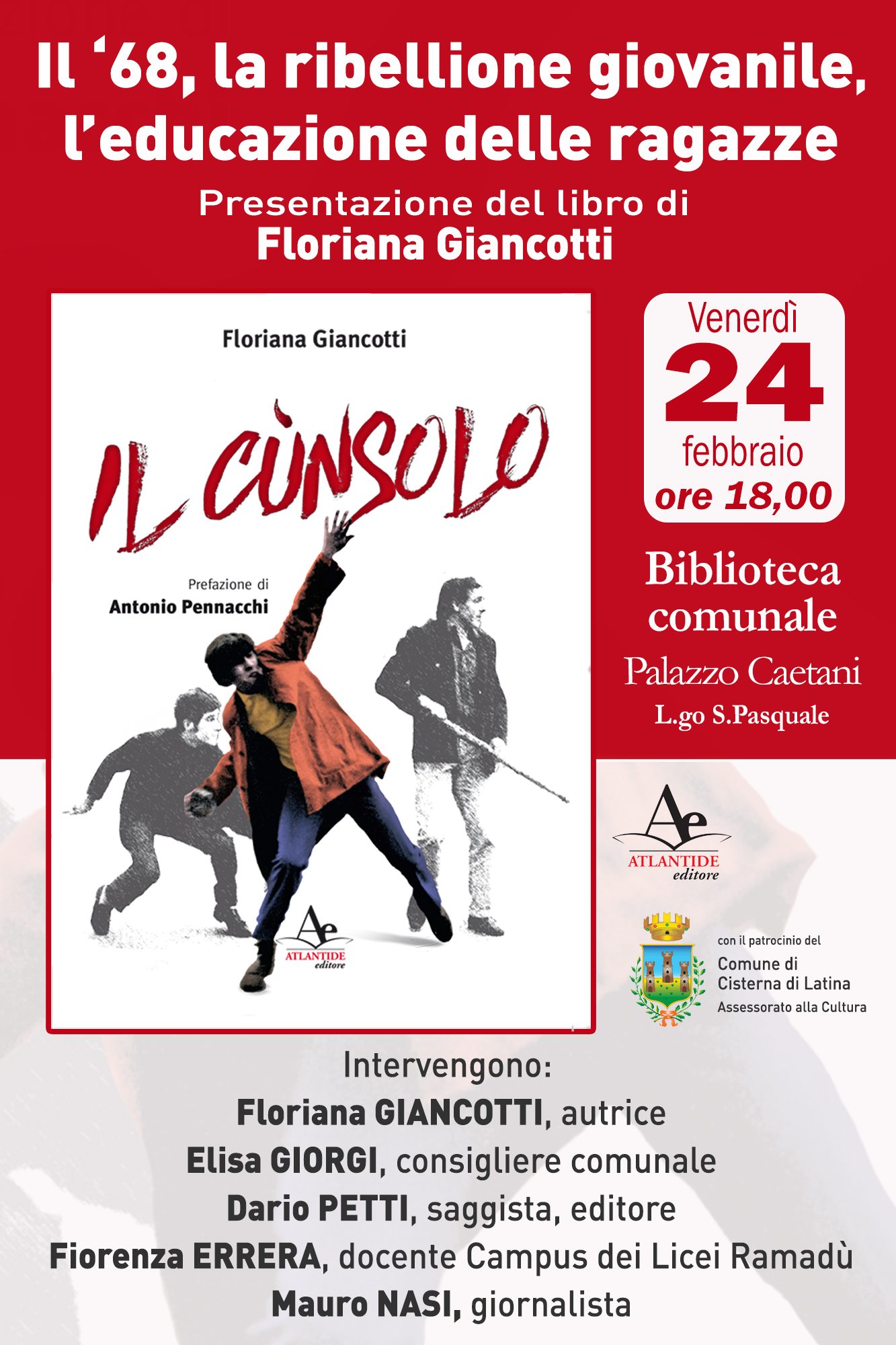 Il movimento del ’68, la ribellione giovanile, i mutamenti nei comportamenti e nell’educazione delle ragazze all’interno di una famiglia tradizionale “sconvolta” dalla grande contestazione studentesca e operaia. Questi i temi conduttori del libro di Floriana Giancotti, “Il Cùnsolo”, con prefazione di Antonio Pennacchi, che verrà presentato a Cisterna presso la Biblioteca comunale di Palazzo Caetani, oggi pomeriggio alle ore 18, con la partecipazione dell’autrice, di Elisa Giorgi consigliere comunale, di Fiorenza Errera docente di lettere nel campus dei licei “Ramadù”, testimone dell’epoca, del giornalista Mauro Nasi, che modererà l’incontro, e di Dario Petti in rappresentanza della Atlantide editore che ha pubblicato il libro. Il romanzo è ambientato a Latina che in quegli anni, come Cisterna, grazie a una forte presenza giovanile e operaia visse con intensità le inquietudini generazionali, le utopie politiche e le lotte che reclamavano giustizia sociale e uguaglianza. L’inizio della storia vede quattro fratelli riunirsi con le loro famiglie per ricordare il padre recentemente scomparso. Durante il lungo pranzo, il cùnsolo appunto come viene chiamato nei paesi lepini il banchetto consolatorio per la perdita di un familiare, ripercorrono la loro vita, dall’infanzia in un piccolo paese collinare fino al trasferimento nella città nuova, Latina, proprio durante gli anni del boom economico e delle lotte studentesche. Tra una portata e l’altra, sollecitati dal buon vino che scorre in abbondanza e incalzati dalle domande dei nipoti, i ricordi riaffiorano impietosi demolendo l’immagine di una famiglia e di un’educazione “perbene” che tutti hanno contestato in modi diversi a seconda dell’età. Le sorelle del giovane protagonista, Chicco, vivono con entusiasmo la modernità che cambia le loro vite portandole a scelte diverse da quelle che i genitori avevano immaginato per loro, ed accompagnano nella crescita l’unico fratello maschio difendendolo dalla severità dei genitori, della scuola e della società. Chicco, inizialmente tutto preso dal calcio, giocatore del Cos Latina, e dalle nuove mode dell’abbigliamento e dei capelli, approda all’università, dove si butta nel movimento studentesco e poi in Lotta Continua. L’arrivo della violenza tanto evocata negli slogan scuoterà il giovane che la rifiuterà abbracciando nuove scelte di vita e di impegno. Floriana Giancotti, per molti anni preside del Liceo scientifico “Majorana” di Latina, attenta studiosa del territorio pontino, ha partecipato alla vita politica della città come consigliere comunale e recentemente collaborato con il Comune di Ventotene come Assessore alla Cultura. Nel 2011 ha pubblicato con l’editore Sovera il suo romanzo d’esordio: “A dìje piacènte”, romanzo storico ambientato nel sud pontino, tra Ottocento e metà del Novecento.