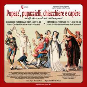 “Allegria e divertimento a Gaeta, a partire da domani 25 a martedì 28 febbraio con carri allegorici, gruppi danzanti, animazione ma anche baruffe di Carnevale per la festa più divertente dell’anno: tutta la città sarà coinvolta in un turbinio di maschere, musica e danze. Il Carnevale 2017 prenderà il via sabato 25 febbraio con le iniziative promosse dall’Associazione Imprese Oggi, con il patrocinio del Comune di Gaeta ed in collaborazione con l’Associazione Carristi del Golfo. Partner dell’evento Radio Spazio Blu, Radio Tirreno Centrale e Visual Sonic. L’appuntamento è alle ore 16.30 con la sfilata dei carri che partirà da Villa delle Sirene, e proseguendo sul Lungomare Caboto fino a Porta Carlo III raggiungerà Corso Cavour, dove si svolgerà l’esibizione dei carri allegorici e dei gruppi partecipanti. Verso le ore 18 sul palco in Piazza della Libertà, prenderà il via la festa dei bambini con animazione, gadget e palloncini. Domenica 26 febbraio la sfilata dei carri si sposterà su Via Marina di Serapo e si dirigerà verso Gaeta Medievale fino a Piazzale Caboto. Qui nel pomeriggio a partire dalle ore 14.30 la festa continuerà con i gruppi danzanti, momenti di intrattenimento e l’esposizione dei carri allegorici. Sempre domenica 26 febbraio, a partire dalle ore 19, con il patrocinio del Comune di Gaeta, l’Associazione Culturale Openspace La Compagnia delle Nuvole animerà i vicoli aragonesi del Centro Storico di Gaeta Medievale con la manifestazione “Pupazz, Pupazziell, Chiacchiere e Capère”. Gli attori, diretti da Cosmo Di Mille, porteranno in scena tante piccole baruffe di Carnevale per sorridere un po’ insieme. Il pubblico, partendo da Piazza Cardinal De Vio, sarà chiamato a spostarsi seguendo una guida che lo accompagnerà presso varie postazioni proprio come accade nei miracle plays. Da qui assisterà all’interpretazione di brani del Carnevale tratti da commediografi e comici di tutti i tempi tra cui Capuano, Benni, Rota, Di Giacomo, Scarpetta e tanti altri. Martedì 28 febbraio, dalle ore 19, La Compagnia delle Nuvole porterà lo spettacolo nella zona dei Castelli di Via Indipendenza e nei vicoli adiacenti. Si ringraziano le imprese di Gaeta e l’Ass. Culturale La Compagnia delle Nuvole per l’impegno profuso nell’organizzazione e realizzazione degli eventi. L’appuntamento, quindi, con il Carnevale più festoso e divertente, per grandi e piccini, è a Gaeta a partire da sabato 25 fino a martedì 28 febbraio. Vi aspettiamo numerosi … tutti in maschera ovviamente!”.