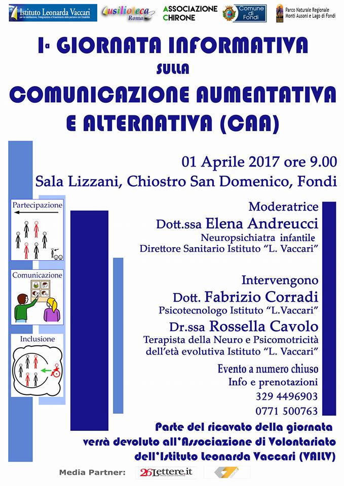 Sabato 1° aprile nella Sala Lizzani dell’Auditorium San Domenico di Fondi avrà luogo la prima “Giornata Informativa sulla Comunicazione Aumentativa e Alternativa (CAA)” organizzata dall’Associazione Chirone e dall’Istituto Leonarda Vaccari di Roma, con il patrocinio del Comune di Fondi e del Parco Naturale Regionale dei Monti Ausoni e Lago di Fondi, con la partecipazione dell’Ausilioteca di Roma. Il meeting, che avverrà durante la Settimana Blu per l’autismo, consiste nella proposta di una giornata di conoscenza e approfondimento delle strategie sulla Comunicazione Aumentativa e Alternativa (CAA) rappresentante un insieme di approcci, strategie e strumenti per le persone che presentano assenza totale o parziale presenza del linguaggio verbale. Grazie a tecniche e strumenti di CAA molte persone disabili sono ora in grado di utilizzare un codice efficace che dà loro la possibilità di usufruire di nuove opportunità educative e sociali. Durante il meeting interverranno: Fabrizio Corradi, Psicotecnologo dell’Istituto Leonarda Vaccari di Roma, Rossella Cavolo Terapista della Neuro e Psicomotricità dell’età evolutiva dell’Istituto Leonarda Vaccari di Roma e modererà l’incontro la Dott.ssa Elena Andreucci Neuropsichiatra infantile e Direttore Sanitario dell’Istituto Leonarda Vaccari di Roma. Parte del ricavato della giornata verrà devoluto all’Associazione di Volontariato dell’Istituto Leonarda Vaccari (VAILV). Al termine del meeting sarà rilasciato un attestato di partecipazione.