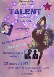 Questa sera presso l’Auditorium M. Costa alle ore 21:00 la Sati Spettacolo, sotto la direzione artistica di Sara Tini, presenterà la sesta edizione di “Talent”, una serata ricca di esibizioni di danza e canto. Gli spettatori potranno assistere alla varietà di stili offerti dal panorama artistico del territorio, ammirando sul palco l’alternarsi dei giovani talenti. Le esibizioni quest’anno saranno valutate da una giuria d’eccezione, composta da Ilir Shaqiri, ballerino del programma televisivo “Amici” e Claudio e Paolo Ladisa, ballerini professionisti e insegnanti di danza, danza aerea e acrobatica. I tre artisti avranno il compito di assegnare delle borse di studio per il campus estivo “Festival di danza città di Sabaudia”, con la direzione artistica di Andrè De La Roche e Ilir Shaqiri, che avrà luogo questa estate dal 31 agosto al 3 settembre. I ringraziamenti sono rivolti in particolare al presidente della banca del credito cooperativo Manfrin per aver appoggiato e creduto nel progetto, e a tutte le scuole che parteciperanno alla serata, ASD I colori dell’anima, ASD Desio, La SILPHIDE, Passione danza, Studio dance, Petali rosa, Art Maison, Studio Danza 21.