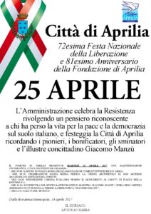 Ricorre il prossimo 25 aprile, come noto, la 72esima Festa Nazionale della Liberazione dell’Italia dal nazifascismo, concomitante con l’81esimo Anniversario della cerimonia di posa della prima pietra della Città di Aprilia, quarto comune di Fondazione dell’Agro pontino bonificato. Per l’occasione, l’Amministrazione Comunale promuove una cerimonia istituzionale per ricordare i caduti della Resistenza, che hanno sacrificato la vita per la restituzione della pace e della democrazia sul suolo italiano, nonché per celebrare i pionieri e i bonificatori di Aprilia, spesisi per rendere ospitali e coltivabili le terre pontine, e gli sminatori del dopoguerra. Non ultimo, l’Amministrazione ha scelto di celebrare il Maestro Giacomo Manzù, illustre concittadino onorario di Aprilia, attraverso la cerimonia di scopertura di un mezzobusto in bronzo a lui dedicato, opera del Maestro apriliano Tony Di Nicola, prematuramente scomparso. Il programma della manifestazione prevede il raduno alle ore 9 delle Autorità Civili, Militari e delle rappresentanze delle Associazioni Combattentistiche e D’Arma in Piazza Roma e, alle 9.30, la celebrazione della Santa Messa presso la Chiesa arcipretale di San Michele Arcangelo e Santa Maria Goretti.