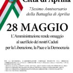 Il Comune di Aprilia, in occasione del prossimo 28 maggio in cui ricorre il 73esimo Anniversario della Battaglia di Aprilia, promuove una giornata celebrativa presso il piazzale della stazione ferroviaria di Campoleone, dove nel 2014 è stata scoperta una targa commemorativa. La manifestazione chiude il circuito celebrativo della memoria dello Sbarco e dei Caduti della seconda guerra mondiale. Il programma prevede il raduno alle 9.30 presso il piazzale della stazione (Campoleone Scalo) e la deposizione di un omaggio floreale da parte del Sindaco di Aprilia. Analoga cerimonia avrà luogo poi alle 10.15 sul territorio di Lanuvio nella vicina Piazza Berlinguer, a cura dello stesso Comune. La giornata celebrativa del 28 maggio è stata formalmente istituita dal Consiglio Comunale con deliberazione n. 3/2013.