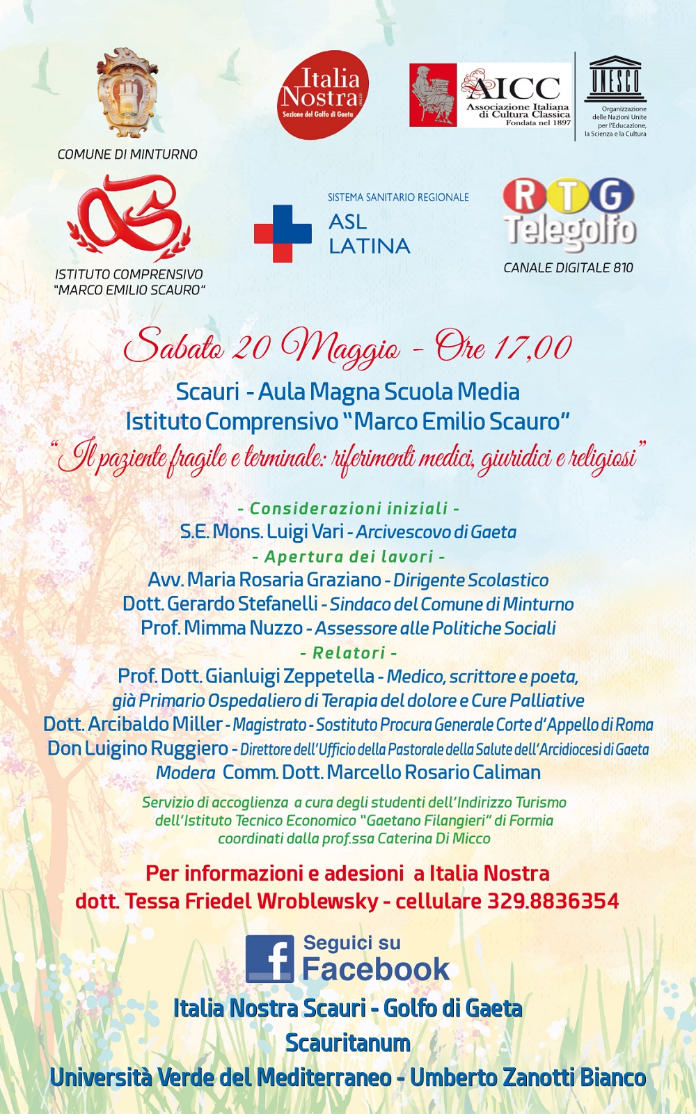 Sabato 20 maggio alle ore 17:00 presso l’aula magna dell’Istituto Comprensivo “Marco Emilio Scauro”, in Via Appia 223 a Scauri di Minturno, si terrà il convegno “Il malato fragile e terminale: riferimenti medici, giuridici e religiosi”, a cura di Italia Nostra – Sezione del Golfo di Gaeta e patrocinato dall’ASL di Latina. Dopo le considerazioni iniziali a cura dell’arcivescovo di Gaeta Luigi Vari, aprono i lavori il dirigente scolastico Maria Rosaria Graziano, il sindaco di Minturno Gerardo Stefanelli e l’assessore Mimma Nuzzo. Le relazioni sono a cura di Arcibaldo Miller, magistrato e sostituto Procura Generale della Corte d’Appello di Roma, don Luigi Ruggiero, incaricato del servizio diocesano di Pastorale della Salute, Gianluigi Zeppetella, medico, scrittore e poeta. Il servizio di accoglienza sarà a cura degli studenti dell’Istituto Tecnico Economico “Gaetano Filangieri”, indirizzo Turismo, coordinati dalla professoressa Caterina Di Micco. Media partner è RTG – Telegolfo, canale digitale 810. Per informazioni e adesioni a Italia Nostra rivolgersi alla dottoressa Friedel Wroblewsky al numero 329.8836354, su Facebook @italianostrascauri.