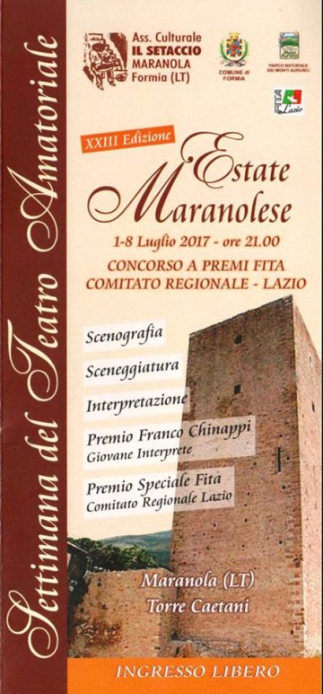 Parte sabato la “Settimana del Teatro Amatoriale di Maranola”, il concorso a premi Fita (Federazione Italiana Teatro Amatori) in programma alla Torre Caetani dal 1 all’8 luglio con inizio alle 21. Giunta alla XXIII edizione, la rassegna promossa dall’Associazione Culturale “Il Setaccio” con il patrocinio del Comune di Formia e del Parco Naturale Regionale dei Monti Aurunci, ospiterà le diverse realtà teatrali che hanno aderito al bando e sono state selezionate dalla segreteria dell’associazione. Tra loro tre compagnie provenienti dalla Campania – “Quelli che… il Teatro” di Nola, “La Bottega del Teatro” di Caserta e la compagnia “30 Allora” di Casagiove – che porteranno in scena inedite commedie in vernacolo (“Una notte con Dora”, scritta da Marco Lanzuise, in programma mercoledì 5 luglio; “Quelli del diploma… 1982”, commedia scritta da Pierluigi Tortora che sarà rappresentata giovedì 6 luglio e “73 ‘o spitale”, commedia scritta e diretta da Vincenzo Russo, in programma venerdì 7 luglio). Ben otto le serate di spettacolo. L’edizione saluto il ritorno della Compagnia Teatrale “Bertolt Brecht” di Formia che lunedì 3 luglio porta in scena “Il gobbo di Notre Dame”, piéce di Maurizio Stammati cui, nell’occasione, sarà conferito anche un Premio alla carriera. La compagnia “Il Setaccio” parteciperà con due lavori scritti e diretti dal Direttore Artistico Antonio Forte. Esordio sabato 1 luglio con la commedia dialettale “Raffeluccio gliu Bannista”, già rappresentata a Natale ed incentrata sulla figura di Raffaele D’Avellino, storico banditore maranolese rimasto nella memoria collettiva del borgo. Sabato 8 luglio alle ore 21 sarà invece rappresentata “La catapecchia” che chiuderà la rassegna, seguita dalla premiazione delle Compagnie vincitrici, scelte da una giuria popolare di spettatori per interpretazione, scenografia e sceneggiatura. Sarà conferito anche il premio per il giovane interprete, promosso anche quest’anno da una delle aziende della ristorazione più antiche di Formia (Chinappi). Partecipano alla rassegna anche il Laboratorio Teatrale Castelforte che martedì 4 luglio porterà in scena “La paura non esiste” (commedia di Nicola Pagano, regia di Tommaso Testa) e la compagnia “I LavorAttori” di Fondi che presenteranno “La groja”, commedia scritta e diretta da Mena Antonelli”.
