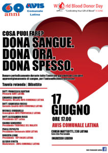 L’Avis Comunale di Latina quest’anno compie 60 anni e in occasione della Giornata Mondiale del Donatore di Sangue l’Associazione ha voluto iniziare i festeggiamenti parlando di donazione e offrendo dei servizi di prevenzione alla cittadinanza direttamente nella sua piazza principale. “Sarà infatti un fine settimana con un doppio appuntamento quello di sabato 17 e domenica 18 – dichiara Emanuele Bragato VicePresidente della Sezione e responsabile delle celebrazioni per i 60 anni di Avis Latina – il primo presso la Sede Avis di Corso Matteotti 238, sarà un dibattito o meglio una tavola rotonda tra l’Azienda Sanitaria con l’intervento del Primario del SIMT, Dott. Francesco Equitani e le associazioni sociosanitarie facenti parte del Tribunale del Malato guidati da Gianna Sangiorgi. “Dona sangue, Dona ora, Dona spesso” è lo slogan che guiderà l’incontro dove agli interventi dei relatori si avvicenderanno le testimonianze di chi quel dono lo hanno ricevuto. Domenica 18 invece l’appuntamento è in Piazza del Popolo dalle 9.00 alle 13.00 dove festa e prevenzione animeranno la mattinata. Verranno effettuati elettrocardiogrammi, emoglobina, misurazione di pressione. Quello che solitamente è riservato al donatore lo potrà fare anche chi donatore non lo è, con la speranza che possa capire l’importanza di questo gesto. Ma non solo, con la collaborazione dell’associazione Doc4Life verranno effettuati corsi gratuiti di Primo Soccorso e Disostruzione delle vie aeree. Ma c’è spazio anche per i più piccini, con l’associazione di Clownterapia 009 Missione Sorrisi – Vip Latina e con i Trapper che con le loro attività scoutistiche coinvolgeranno tutti i bambini presenti in Piazza. Alle 12.30 alla festa avisina si unisce l’Aido con l’arrivo della Staffetta della Vita partita da Sabaudia.