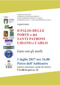 Nella giornata di domani, sabato primo luglio si terrà la prima edizione del Palio delle porte di Sezze e dei Santi Patroni San Lidano e San Carlo. A partire dalle ore 16:00 presso il campo di gara del’Anfiteatro, si svolgerà il primo palio cittadino. Le quattro porte di Sezze (Porta Pascibella, Porta Romana, Porta Paolina e Porta Sant’Andrea) saranno rappresentate da quattro cavalli, i quali si sfideranno nella corsa agli anelli per aggiudicarsi il primo trofeo. Il comitato Colli, promotore della manifestazione, invita tutta la cittadinanza ad assistere alla spettacolare gara. In rappresentanza dell’Amministrazione ci sarà anche il sindaco appena eletto, Sergio Di Raimo.