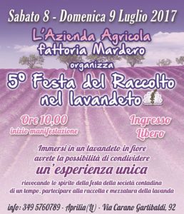 Si terrà sabato 8 e domenica 9 luglio, con ingresso libero presso l’azienda agricola Fattoria Mardero di Carano, la quinta edizione della Festa del Raccolto nel lavandeto. L’appuntamento, ormai tradizionale e dedicato a tutta la famiglia ed in particolare ai più piccoli, ha in programma rievocazioni storiche legate al mondo dell’agricoltura e convegni per riflettere sul futuro del settore nel contesto pontino. Nelle due giornate sono previsti laboratori per i più piccoli dedicati alla lavanda, corsi di disegno e fumetto, realizzazione di spaventapasseri e bamboline con la foglia del mais, dimostrazione di estrazione in corrente di vapore dell’olio essenziale alla lavanda, realizzazione del sapone e altri prodotti della cosmesi, giochi popolari e animazione. Nel corso della manifestazione sono previsti l’allestimento di uno stand gastronomico a cura dell’Alfa e di un’area con operatori olistici ed espositori a cura dell’Associazione “Il Cambia Mondo”. Quanto agli incontri e ai dibattiti pubblici, sabato 8 luglio alle 11 si terrà il convegno sul merletto e sul ricamo; domenica 9 luglio alle 11 il convegno sulla storia della borgata di Carano Garibaldi, dal tema “Le nostre radici”; a seguire, alle 16, il convegno dal tema “Tornare indietro per andare avanti” con la partecipazione dell’Assessora all’Ambiente Alessandra Lombardi; infine, ancora domenica, alle 18, si terrà il convegno “Il Marchio di Aprilia in Latium”, con la partecipazione dell’Assessore alle Attività Produttive Vittorio Marchitti.