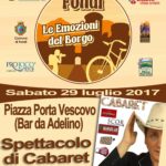 Domani alle ore 22.00 in Piazza Porta Vescovo, si terrà lo spettacolo ad ingresso libero “Tato Cabaret”. La strada (dal Bar di Adelino fino alla Torretta della Pro Loco) sarà opportunamente chiusa al traffico e si trasformerà in un salotto-teatro all’aperto. L’iniziativa si inserisce nel progetto “Fondi – Le Emozioni del Borgo”, ideato dal Comune di Fondi e cofinanziato dalla Regione Lazio e per la cui attuazione collaborano l’Associazione Pro Loco Fondi, i Parchi dei Monti Ausoni e degli Aurunci e associazioni cittadine. Con lo spettacolo comico del cabarettista Tato viene offerta a visitatori, turisti e cittadini una serata di puro divertimento e di ulteriore conoscenza della Città: prima dello spettacolo si potrà infatti scoprire l’antico borgo di Fondi usufruendo gratuitamente delle visite guidate a cura di guide turistiche abilitate e dei servizi “Borgo in bici” – guidato e libero – svolti in collaborazione con l’Associazione Pro Loco Fondi. I servizi permetteranno di percorrere in autonomia piazze e vicoli del centro storico o di effettuare “Bike tours” liberi spostandosi circolarmente intorno al borgo visitando la Portella, le Mura ciclopiche, il giardino di Villa Cantarano, Porta Vescovo, piazza Unità d’Italia. Il progetto prevede anche l’apertura straordinaria di siti d’interesse storico-culturale, quali il Castello e il Palazzo Caetani, il Complesso di San Domenico e il Museo Ebraico. Nel corso della serata non mancherà l’occasione, per chi lo desidera, di degustare prodotti enogastronomici. Tato – noto comico cabarettista che ha partecipato alle trasmissioni televisive “Eccezionale veramente”, “Colorado Lab”, “Salvi chi può!”, “Comic Ring Show” – è incontenibile attraverso i suoi esilaranti personaggi. La sua grande passione è quella di presentarsi nei ristoranti di tutta Italia come un vero e proprio cameriere ma in realtà… è un tipo molto, ma molto sballato! Con moderata classe e nonchalance, inizia la sua performance vestito da cameriere “serio”, come un vero e proprio addetto alla sala di qualsiasi locale di ristorazione.