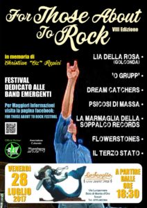Torna per la sua VIII edizione il festival dedicato alle band emergenti. Nato nel 2005 per volere di Mauro Iannotta, e svoltosi anno dopo anno fino al 2011 con l’aiuto di Maurizio Russo, il For Those About To Rock torna, grazie anche alla collaborazione di Angela Rossi e Gianluca Merenda, per offrire un palco ai gruppi musicali emergenti che sempre più spesso non trovano spazi a loro dedicati. Il Festival si svolgerà il 28 luglio presso lo storico pub Lo Scoglio sito in Scauri, che proprio quest’anno festeggia i suoi primi 50 anni di attività e che nel corso del tempo si è sempre più affermato come un luogo di culto per i musicisti della zona. La conduzione del festival è lasciata a Lia Della Rosa, mentre sul palco si alterneranno a partire dalle ore 18:30 O’Grupp, Dream Catchers, Psicosi Di Massa, La Marmaglia Della Soppalco Recors, Flowerstones e Il Terzo Stato. Cosa più importante è che l’edizione di quest’anno sarà interamente dedicata alla memoria di Christian “Oz” Repici, precocemente scomparso e che più volte e con diverse formazioni ha partecipato al For Those About To Rock. Questo il messaggio dei familiari: “Aspettavamo con ansia questo evento musicale per ricordare Christian, che tanto ha amato questa arte con una continua ricerca di stili e suoni che potessero distinguerlo. Grazie di cuore a Gianluca e tutti i suoi compagni di tante serate alla ricerca di quelle emozioni che solo la bella musica o il bel canto può dare. Dopo tre anni che Daniele Urciolo ci faceva rivivere la parte letteraria e cinematografica di nostro figlio ecco finalmente arrivare, grazie ai suoi amici artisti con la A maiuscola, la parte che forse condivideva di più con mamma, papà Daniele e Roberta perché non era raro che tutti insieme spesso prendessimo uno strumento ed intonavamo una canzone. Siamo certi sarà una festa come piaceva a Lui, quando era su quel palco diventava tutto magico. Ecco viviamo fino in fondo questa magia. Grazie ragazzi vi vogliamo bene”.