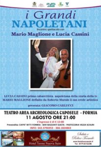 Appuntamento da non perdere quello in programma il prossimo 11 agosto nel teatro dell’area archeologica Caposele a Formia con due grandi artisti napoletani: Lucia Cassini e Mario Maglione. Lucia Cassini fu la prima cabarettista partenopea ad essere stata protagonista degli show di Rai Uno e di molti film. Mario Maglione, che Roberto Murolo ha espressamente indicato suo erede artistico, è l’unica voce a rappresentare la canzone classica napoletana in molti Paesi del mondo. Stimolati da Giacomo Carlucci, ripercorreranno i momenti salienti della loro carriera racconteranno pettegolezzi e aneddoti. Tutto sarà pretesto per riproporre i loro pezzi forti, nella comicità e nella musica. L’efficacia di questo format, già sperimentato da altri noti personaggi, punta anche sul coinvolgimento del pubblico che avrà la sensazione di aver partecipato e non solo assistito ad uno spettacolo. L’appuntamento è alle ore 21:00.