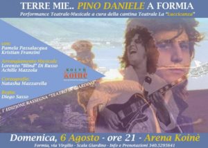 Dopo le perfomance invernali, ritorna in versione estesa, in occasione della Rassegna “Teatro in Giardino”, lo spettacolo teatrale-musicale dedicato ad uno dei più importanti musicisti e cantante italiano: Pino Daniele. Vissuto per molti anni a Formia, dove ha aperto uno studio di registrazione, “Bagaria”, la performance artistica rappresenta in scena, proprio il periodo formiano e il rapporto con questa seconda terra e i suoi concittadini, periodo e luogo dove Pino Daniele, compone alcuni dei suoi album più significativi e musicalmente innovativi che lo fanno apprezzare a livello mondiale. Una kermesse a cura della Cantina Teatrale La “Luccicanza” che si terrà domenica 6 agosto alle 21 presso l’Arena Koinè in via Virgilio a Formia. Per info e prenotazioni 340 5295641. Narratore e interprete : Kristian Franzini e Pamela Passalacqua. Musicisti: Lorenzo “Blind” Di Russo: Voce/Chitarra, Achille Mazzola: Tastiere. Danza: Natasha Mazzarella. Regia: Diego Sasso.