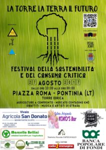 Il Festival della Sostenibilità e del Consumo critico, organizzato dalle Associazioni Culturali Cantiere Creativo, Kuddiaattalora, Visual Track, Botteghe Invisibili, con il patrocinio del Map_Museo dell’Agro Pontino e del Comune di Pontinia, è un Festival d’integrazione tra arte e agricoltura, tra musica egiochi, tra fotografia e artisti di strada, tra forme di comunicazione e partecipazione, tra conoscenze e racconti. Il Festival si svolgerà domenica 27 agosto in Piazza Roma a Pontinia (LT), presso la ex Torre Idrica,