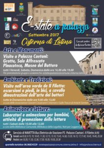 Sta per aprirsi un nuovo weekend ricco di appuntamenti a Cisterna. Con “E-state a Palazzo” tutti i venerdì, sabato e domenica di settembre dalle 16 alle 19 è possibile visitare le bellezze storico-culturali e artistiche custodite all’interno di Palazzo Caetani: grotte, affreschi, museo del buttero, pinacoteca e tanto altro spiegati dai ragazzi dello Sportello Turistico. Questo sabato andrà in scena anche il penultimo appuntamento della rassegna “Libri a Corte”: Marco Bellinazzo (Il Sole 24 ore) presenterà il suo “I veri padroni del calcio. Così il potere e la finanza hanno conquistato il calcio mondiale” (Feltrinelli). Coordinerà la presentazione pubblica dell’opera il giornalista Tonj Ortoleva. Il sabato inoltre, dalle 10 alle 12, si terranno nella biblioteca e in altri spazi del Palazzo, laboratori e animazione per bambini (su prenotazione) nel segno della promozione della lettura. Questa settimana sono previste le Letture #abassavoce del gruppo Nati per Leggere Lazio dedicate ai bambini da 0 a 6 anni. Per i più grandi invece, dai 6 ai 10 anni, letture tematiche e visite guidate a Palazzo. Per maggiori dettagli e prenotazioni contattare la Biblioteca comunale di Cisterna all’indirizzo e-mail – biblioteca@comune.cisterna.latina.it o telefonicamente allo 0696834330. La domenica, dalle 9 alle 13, “Conosciamo Il Filetto” attraverso visite guidate e passeggiate a cavallo, in bici o a piedi presso l’area verde cisternese (ingresso in via Monti Lepini). L’iniziativa ecologica, culturale e paesaggistica è curata dalle associazioni Sulle Tracce di Antichi Sentieri e Giovani Cavalcanti cisternesi. Si ricorda inoltre, che il servizio bus navetta collegherà la stazione ferroviaria con Piazza XIX Marzo (Palazzo Caetani) e il Filetto.