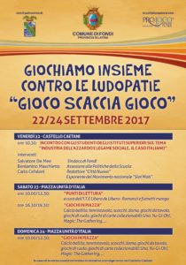 Il Comune di Fondi, con il patrocinio della Provincia di Latina e in collaborazione con la Pro Loco Fondi, organizza a partire da oggi al 24 settembre prossimi la manifestazione “Giochiamo insieme contro le ludopatie – Gioco scaccia gioco” al fine di sensibilizzare la cittadinanza e in particolar modo le giovani generazioni su un fenomeno gravissimo che dilaga di anno in anno e al tempo stesso di promuovere occasioni di gioco sano e creativo e di socializzazione. L’iniziativa fa seguito all’approvazione di una mozione presentata dal consigliere comunale Maria Civita Paparello – condivisa pienamente dai presidenti delle commissioni Attività produttive Stefania Stravato e Bilancio Vincenzo Carnevale e approvata all’unanimità dal consiglio comunale nello scorso mese di maggio – di istituire giornate “del buon gioco” in contrasto al gioco d’azzardo e alle ludopatie. Il programma prevede questa mattina alle 10.30 nella sala convegni del castello Caetani l’incontro con gli studenti degli istituti superiori sul tema “Industria dell’azzardo e legame sociale. Il caso italiano”. Interverranno il sindaco di Fondi Salvatore De Meo, l’assessore alle Politiche della Scuola Beniamino Maschietto e il redattore di “Città Nuova” ed esponente del Movimento nazionale “Slot Mob” Carlo Cefaloni. Domani 23 dalle 10 alle 12.30 in piazza Unità d’Italia saranno allestiti “Punti di lettura” a cura dell’I.T.E. Libero de Libero, con romanzi e fumetti a disposizione dei cittadini di ogni età e pubbliche letture. Dalle 16.30 alle 19.30, sempre in piazza Unità d’Italia, sarà la volta dei “Giochi in piazza”, con gazebo allestiti per ospitare calcio balilla, tennistavolo, scacchi, dama, giochi da tavolo, giochi di ruolo, giochi di carte collezionabili come Uno, Yu-Gi-Oh!, Magic: The Gathering, ed altri. L’iniziativa “Giochi in piazza” sarà replicata domenica 24, negli stessi spazi, dalle 10 alle 12.30. In caso di avverse condizione metereologiche tutte le iniziative si svolgeranno al pianterreno e nella sala superiore del castello Caetani.