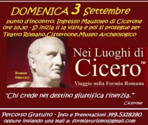 Come è ormai consuetudine, ogni prima domenica del mese, in occasione delle ‘Domeniche al Museo’ promosse dal MIBACT, Formia Turismo propone un percorso gratuito in quattro luoghi della città, per conoscerla meglio, accompagnati dai suoi volontari. Questa volta l’appuntamento è per domenica 3 settembre, alle 10,30 davanti al cancello del Mausoleo di Cicerone, a 800 metri dal centro della città. Chi viene in macchina potrà parcheggiare nella stradina di fronte al cancello; chi viene in bici potrà portarla direttamente all’interno. Prima Tappa: MAUSOLEO DI CICERONE; ore 10,30 fino alle 11,00. Seconda Tappa: CISTERNONE ROMANO: dalle 11,15 alle 11,40 – Probabilmente la più antica “Basilica Sotterranea Romana”. Nel Cisternone sarà anche possibile vedere istallazioni multimediali che riproducono volti e statue conservate nel MuseoArcheologico Nazionale. Terza tappa: TEATRO ROMANO DI FORMIA (Gliu’ Canciell) dalle 11,45- Costruito nel periodo Augusteo del 1′ sec. a.C.oggi resta una parte visibile inglobata nelle costruzioni successive. La “cavea” del Teatro , come quasi tutti i teatri romani, fu appoggiata dai costruttori sul declivio del colle di Castellone disposto in modo che gli spettatori guardassero a sud verso il mare e sicuramente protetti da un apposito “velarium” . Quarta Tappa: MUSEO ARCHEOLOGICO NAZIONALE – Dalle 12,00 alle 12,45 –Il Museo, realizzato nel1997, costituisce l’ampliamento di un precedente Antiquarium istituito nel 1968, dopo la distruzione, avvenuta durante la guerra, di una sede civica risalente agli anni Trenta., inoltre, una bellissima erma bifronte e i 5 volti svelati rinvenuti nella cosidetta “Villa di Mamurra”.