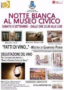 Sabato 9 settembre, in occasione della Notte Bianca, è prevista l’apertura straordinaria del Museo Civico Archeologico di Norma dalle 21 alle 2. Il programma prevede la Mostra di acquerelli e vinarelli, di Giampiero Pierini dal titolo “Fatti di vino…”. la pittura di Giampiero Pierini è arte nelle forme più pure, espressione di un innato talento e narrazione estetica. A seguire la degustazione di vino presso il “Banco di Assaggio CASALE DEL GIGLIO”, in collaborazione con l’azienda Casale del Giglio. L’ingresso è gratuito.