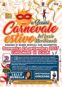 Domenica 24 settembre sul lungomare di Scauri si festeggerà il Carnevale estivo del Lazio meridionale. Il programma della giornata prevede: ore 16.30: piazzale Luigi Ranieri, raduno dei carri allegorici; ore 17.30: sfilata dei carri, delle bande musicali, dei gruppi mascherati e di animazione; ore 18.30: piazzale ex Sieci, arrivo del corteo, animazione per bambini, mascottes, esibizione artisti di strada, spettacoli di arte varia, concertone delle bande musicali. Ospite speciale dell’evento, da ‘Made in Sud’, Lello Musella. Informazioni presso l’ufficio Turismo-Cultura del comune di Minturno: 0771.6608250 – info@comune.minturno.lt.it.