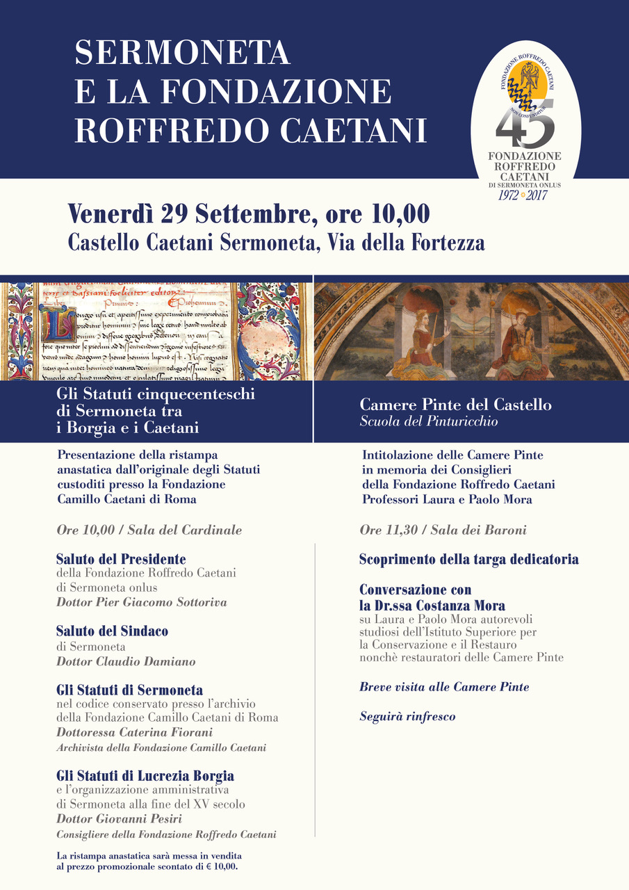 La Fondazione Roffredo Caetani di Sermoneta onlus nella ricorrenza dei primi 45 anni della sua istituzione e in omaggio ad i suoi scopi Statutari, ha deciso di ripubblicare in edizione anastatica gli Statuti della città di Sermoneta del primissimo Cinquecento, l’originale dei quali è conservato presso l’Archivio della la Fondazione Camillo Caetani di Roma.