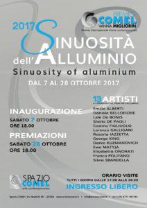 È giunta alla sua fase conclusiva la VI edizione del Premio COMEL Vanna Migliorin Arte Contemporanea, il concorso che promuove le possibilità espressive, estetiche, comunicative e costruttive dell’alluminio, premiando gli artisti che hanno saputo meglio declinare il tema di quest’anno: la sinuosità dell’alluminio. Il bando dell’edizione 2017 ha voluto aprire le porte agli artisti di tutto il continente europeo, andando al di là delle barriere geografiche e politiche, per rivolgersi a pittori, scultori, designer ecc. in grado di lavorare l’alluminio e renderlo materia sinuosa e duttile tra le loro mani. La risposta è stata entusiasmante, l’organizzazione ha visto arrivare domande di partecipazione persino da stati non europei (e quindi fuori bando) come Israele, Stati Uniti e Giappone. La selezione non è stata facile, ma la giuria di esperti presieduta da Giorgio Agnisola (Docente di arte sacra presso la Pontificia Facoltà Teologica dell’Italia Meridionale), ha nominato i 13 finalisti che finalmente vedranno esposte le loro opere a Latina a partire da oggi fino al 28 ottobre. Questa sera a partire dalle 18.00 presso lo Spazio Comel Arte Contemporanea (Via Neghelli, 68), alla presenza di artisti, organizzatori, giurati e un folto pubblico di appassionati si darà il via alla fase conclusiva del Premio: la mostra Sinuosità dell’Alluminio. Dopo un’introduzione critica, la serata sarà animata dalla musica del violino di Lucia Dorelli e del violoncello di Fabrizio Dell’Anna. In chiusura dell’esposizione, sabato 28 ottobre, saranno proclamati i vincitori del Premio della Giuria e del Premio del Pubblico, ai quali sarà data inoltre l’opportunità di essere protagonisti di una personale presso lo Spazio Comel Arte Contemporanea. Le opere e gli artisti in concorso: Tempesta di Emilio Alberti (Italia, Como – pittura), In to th’Europa di Daniela Bellofiore (Italia, Roma – pittura), Sigmund di Lele De Bonis (Italia, Torino – scultura), Abbraccio/Hug di Sheila De Paoli (Italia, Milano – scultura), Terremoto di Cosimo Figliuolo (Italia, Bernalda, MT – scultura), Acqua di Lorenzo Galligani (Italia, Firenze – scultura), Senza Titolo di Rosaria Iazzetta (Italia, Napoli – scultura), Holding Pattern di George King (Regno Unito, Londra – scultura), One Day and One Night di Darko Kuzmanovich (Serbia, Belgrado – scultura), Aluminium di Ewa Matyja (Polonia, Poznań – pittura), Se io fossi te… di Elisabetta Onorati (Italia, Cagliari – scultura), Esercito di latta di Franco Politano (Italia, Catania – scultura), Essere linea di luce di Silvia Sbardella (Italia, Ferentino, FR- scultura). La giuria, presieduta da Giorgio Agnisola (Docente di arte sacra presso la Pontificia Facoltà Teologica dell’Italia Meridionale), è composta da Alfredo La Malfa (Curatore e presidente della Fondazione “La Verde La Malfa”, Presidente della Fondazione “Casa della divina bellezza”, Forza d’Agrò, Messina); Marco Nocca (Storico dell’arte, Professore presso l’Accademia di Belle Arti di Roma); Loredana Rea (Direttore Fondazione “Umberto Mastroianni” di Arpino, Docente presso l’Accademia di Belle Arti di Frosinone); Maria Gabriella Mazzola (manager del settore alluminio, imprenditrice dell’azienda promotrice CO.ME.L.).