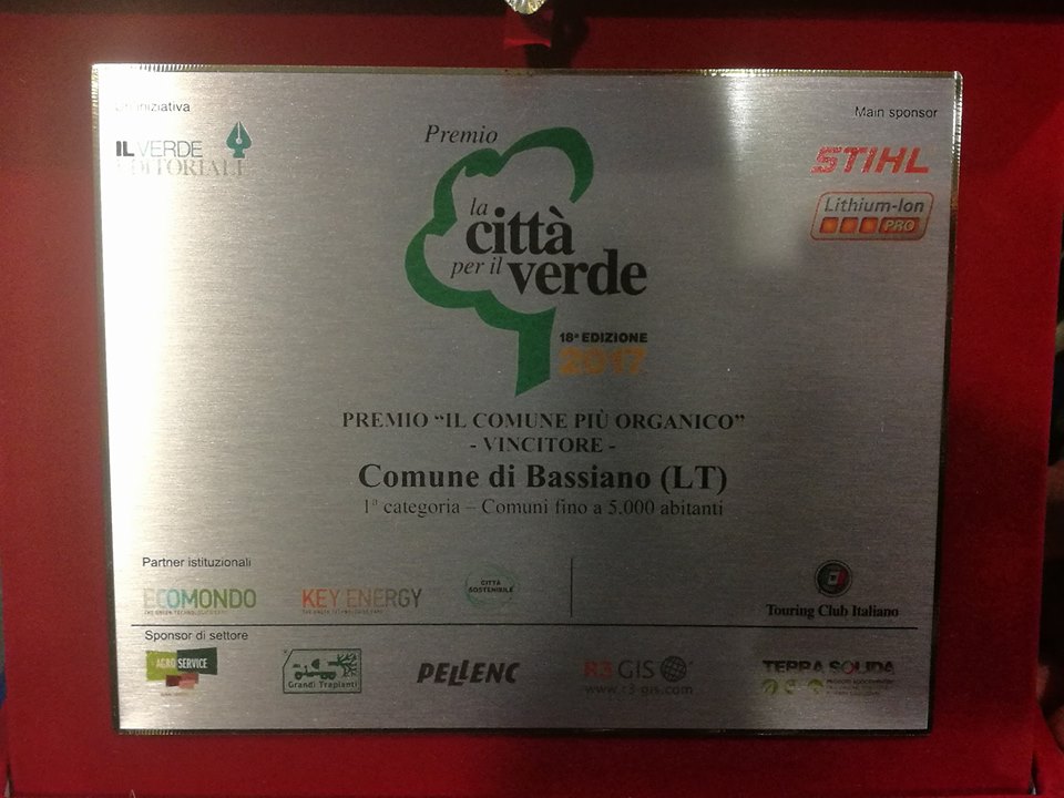Primo posto per il comune di Bassiano al prestigioso premio “la Città per il Verde” edizione 2017, tra i comuni fino 5.000 abitanti. Un premio che è stato consegnato agli amministratori nella cerimonia svoltasi presso la fiera Internazionale di Rimini “Ecomondo – The Green Technologies Expo Energy for Climate” venerdì 10 novembre. Entusiasta il Sindaco Domenico Guidi, che condivide il riconoscimento con tutta la cittadinanza: “Noi come amministrazione abbiamo fatto scelte innovative, mai viste in Provincia, e la popolazione le ha apprezzate e portate avanti collaborando sinergicamente con questo progetto, portandolo ad essere prima una best practice regionale ed ora anche nazionale. L’amministrazione prosegue con orgoglio la valorizzazione del paese, ed i progetti avviati durante questo percorso stanno rappresentanto dei risultati di rilievo”. Grazie agli ottimi risultati ottenuti dalla sua attività di compostaggio di comunità (pioniere della Provincia e tra i miglior esempi regionali) è stato insignito del premio nella sezione “Il Comune più Organico” per la 1° categoria (Comuni fino a 5.000 abitanti). La giuria, riunitasi lo scorso 5 ottobre, ha conferito all’unanimità il premio al Comune di Bassiano. La premiazione si è svolta nella Sala Tulipano del padiglione B6 ed è stata preceduta da un incontro di approfondimento sulle novità del Comitato per lo Sviluppo del Verde Pubblico istituito presso il Ministero dell’Ambiente. “Il prestigioso riconoscimento premia il lavoro di squadra posto in essere da questa amministrazione sul tema dell’ambiente, per l’efficientamento della raccolta e dello smaltimento della frazione organica” commenta il sindaco Guidi al quale fanno eco gli assessori Giovanna Coluzzi e Domenico Sulpizi e il presidente del Consiglio Costantino Cacciotti “nonostante le fantasiose contestazioni poste in essere al fine di sminuire il peso che il paese sta avendo a livello regionale per il proprio impegno, la risposta dell’amministrazione e della comunità che sta percependo sempre più questo progetto hanno permesso di vincere questo prestigioso premio nazionale”.