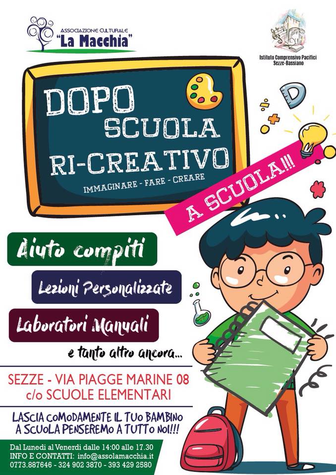 SEZZE ASSOCIAZIONE LA MACCHIA LOCANDINA DOPOSCUOLA RI-CREATIVO Ultimo aggiornamento: 31 Ottobre 2017 22:36 Settimio Brandolini Pubblicato 31 Ottobre 2017 Condividi