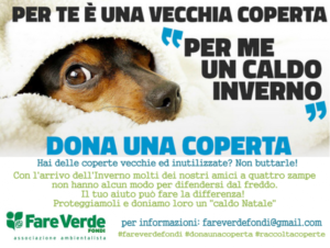 “È arrivato il freddo anche per i nostri amici a quattro zampe”, scrivono dall’associazione Fare Verde di Fondi. “Ogni anno purtroppo sono migliaia i cani che muoiono a causa del freddo. Cani che non riescono ad avere un riparo, a cui non bastano le attenzioni di qualche volontario. Ma possiamo fare qualcosa perché anche loro abbiano un caldo Natale. Nel periodo che dovrebbe renderci tutti più buoni, un pensiero lo vogliamo rivolgere a quei cani meno fortunati, che non hanno un posto in cui riscaldarsi. Ma non accontentiamoci di un pensiero. Possiamo fare qualcosa di concreto, possiamo aderire all’iniziativa ‘Dona una coperta’. Lo scopo è semplice e preciso: raccogliere tutto ciò che possa garantire tepore ai cani che non hanno alcun modo di difendersi dal freddo, dalle coperte ai pile, dai vecchi piumoni fino ai maglioni che non utilizziamo più. Chiunque lo vorrà – continuano da Fare Verde – potrà portare le sue coperte usate o tutto ciò che possa garantire un caldo Natale ai nostri amici a quattro zampe presso la nostra sede di via Cesare Balbo 12, nelle giornate di domani e giovedì 21 dicembre, dalle 18 alle 20. Al termine della raccolta provvederemo a consegnare il tutto alle associazioni del territorio impegnate nella tutela degli animali ed a Cittadini che, di propria spontanea iniziativa, si prendono cura di molti cani con un atto di amore davvero incredibile”.