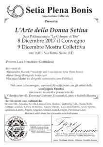 Un evento doppio segnerà il battesimo, venerdì e sabato, di Setia Plena Bonis. La neonata associazione, attraverso un convegno e con una mostra, entrambi nella cornice della Sala Polifunzionale “Le Colonne di Tito”, accende i riflettori su “L’arte della donna setina” nel corso dei secoli. Proprio questo evento al femminile, segna la prima tappa di un percorso che nel corso del 2018 attraverso una serie di eventi ed iniziative tese a valorizzare, rivitalizzare e recuperare storia, tradizioni, usi e costumi di Sezze per far si che dal suo centro storico verso le periferie e viceversa, tornino a pulsare idee ed energie propositive. Il convegno, che vedrà gli interventi di Alessandro Mattei (Presidente dell’Associazione Setia Plena Bonis), Anna Giorgi (Dirigente Scolastico) e Vincenzo Mattei (ex dirigente Amministrazione Pubblica) sarà scandito da momenti musicali, da poesie lette da Valentina Savelli, Eleonora Contento, Emanuela Lutero e Isabella Baratta e da momenti di recitazione curati dagli attori della Compagnia Parsifal. Come detto, l’appuntamento dell’8 dicembre sarà anche occasione per aprire la mostra di artigianato e ricami allestita grazie ai lavori prestati per l’occasione da Silvana Titi, Annalisa Savelli, Liliana Elena Hiuliuc, Gabriella Tulli, Nadia Berti, Patrizia Castaldi, Cinzia Di Raimo, Luigia Minotti, Giovanna Spirito, Adele Spirito, Emanuela Lutero, Angela Angelini, Maria Grazia Leonoro e Pierfranca Gneo. L’appuntamento per tutti, è alle 16 dell’8 dicembre, presso la Sala Polifunzionale “Le Colonne di Tito” a Sezze, in via Diaz.