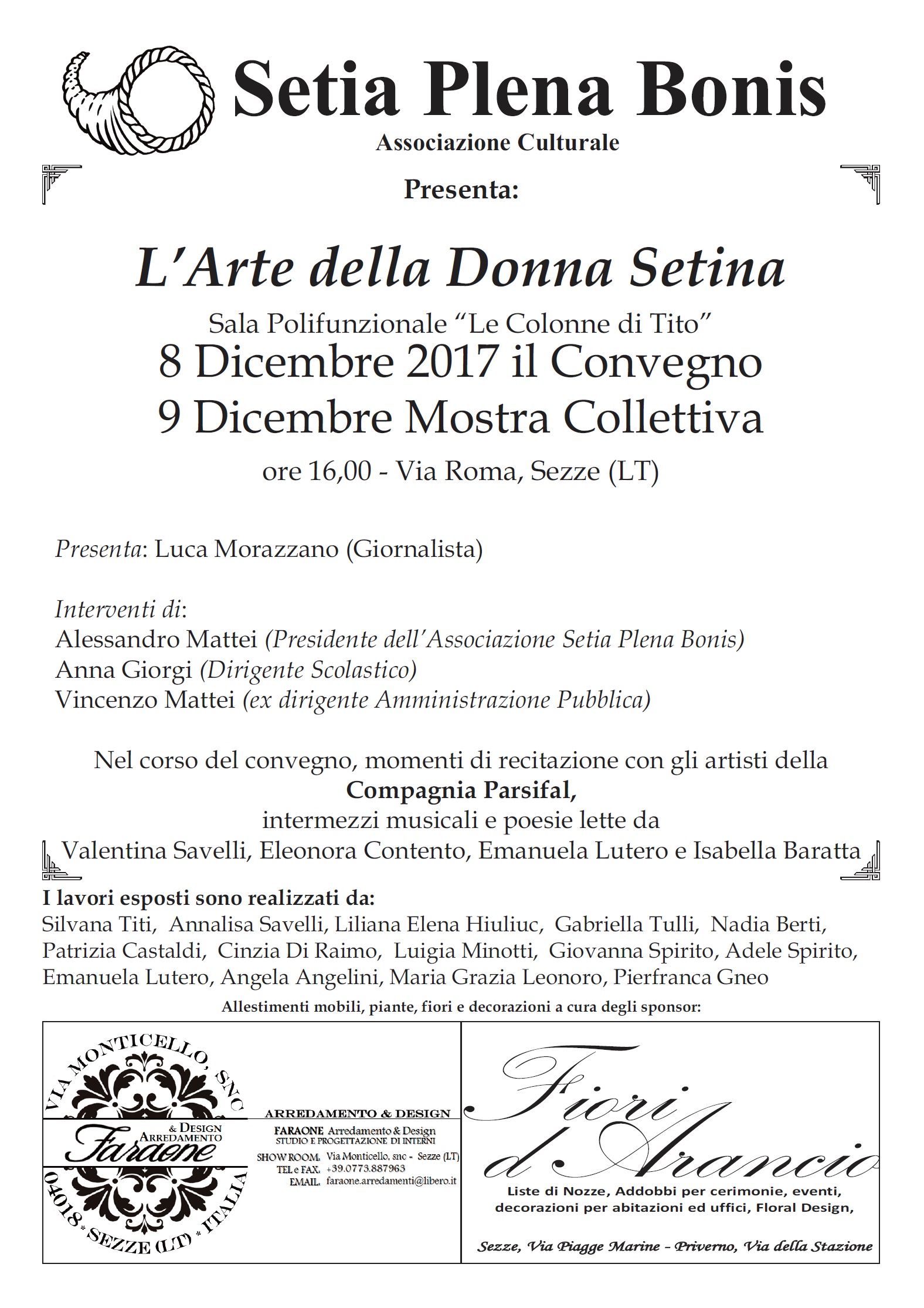 Un evento doppio segnerà il battesimo, venerdì e sabato, di Setia Plena Bonis. La neonata associazione, attraverso un convegno e con una mostra, entrambi nella cornice della Sala Polifunzionale “Le Colonne di Tito”, accende i riflettori su “L’arte della donna setina” nel corso dei secoli. Proprio questo evento al femminile, segna la prima tappa di un percorso che nel corso del 2018 attraverso una serie di eventi ed iniziative tese a valorizzare, rivitalizzare e recuperare storia, tradizioni, usi e costumi di Sezze per far si che dal suo centro storico verso le periferie e viceversa, tornino a pulsare idee ed energie propositive. Il convegno, che vedrà gli interventi di Alessandro Mattei (Presidente dell’Associazione Setia Plena Bonis), Anna Giorgi (Dirigente Scolastico) e Vincenzo Mattei (ex dirigente Amministrazione Pubblica) sarà scandito da momenti musicali, da poesie lette da Valentina Savelli, Eleonora Contento, Emanuela Lutero e Isabella Baratta e da momenti di recitazione curati dagli attori della Compagnia Parsifal. Come detto, l’appuntamento dell’8 dicembre sarà anche occasione per aprire la mostra di artigianato e ricami allestita grazie ai lavori prestati per l’occasione da Silvana Titi, Annalisa Savelli, Liliana Elena Hiuliuc, Gabriella Tulli, Nadia Berti, Patrizia Castaldi, Cinzia Di Raimo, Luigia Minotti, Giovanna Spirito, Adele Spirito, Emanuela Lutero, Angela Angelini, Maria Grazia Leonoro e Pierfranca Gneo. L’appuntamento per tutti, è alle 16 dell’8 dicembre, presso la Sala Polifunzionale “Le Colonne di Tito” a Sezze, in via Diaz.