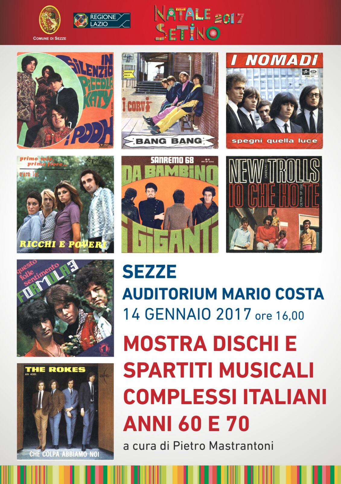 Una mostra sui cimeli, dischi e spartiti soprattutto, riguardanti quello che dagli addetti ai lavori può considerarsi il periodo più importante della musica leggera italiana, quello a cavallo tra gli anni ’60 e il decennio dei ’70. E’ questa l’iniziativa che si svolgerà domenica prossima, 14 gennaio, a partire dalle 16 nei locali del foyer dell’auditorium comunale “Mario Costa” di Sezze, nell’ambito delle iniziative comprese nel Natale Setino 2017, organizzate dal Comune con la partecipazione della Regione Lazio. Ad organizzare la mostra Pietro Mastrantoni, classe 1952, ex operatore sanitario in pensione da due anni, fotografo e collezionista da sempre, grande appassionato di musica sempre alla ricerca, sulla Rete e nei mercatini, di oggetti che spesso finiscono sui tavoli dei rigattieri, ma che invece hanno ancora la loro importanza, anche per testimoniare quei momenti in cui la musica leggere italiana veniva considerata modello di riferimento in Europa e non solo. Un lavoro certosino quello di Mastrantoni, che sicuramente interesserà il pubblico, non solo quello degli over 60, che quel periodo l’hanno vissuto in prima persona, ma anche dei più giovani che si troveranno a che fare con supporti che forse nemmeno conoscono e con gruppi che non hanno mai sentito nominare.