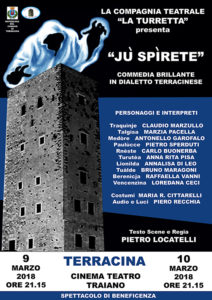 L’Associazione Teatrale “La Turretta” di Terracina, torna sul palco con “Ju Spirete”, commedia brillante dialettale in tre atti, che andrà in scena il 9 e 10 Marzo presso il Cinema Teatro Traiano, a Terracina. Tra spiriti e sotterfugi, preghiere e scongiuri, suore e fattucchiere, tradimenti e giuramenti, baci e “rotta d’ossa”, la divertente rappresentazione promette di farci trascorrere una serata davvero esilarante. Accanto allo scopo di divertire, l’Associazione Teatrale “La Turretta” porta avanti quello che già in diverse altre occasioni è stato lo spirito della propria attività: la solidarietà. Un impegno sociale condiviso anche dal Sig. Luca Renzelli, titolare del Cinema Teatro Traiano, che ha deciso di mettere a disposizione gratuitamente la struttura per entrambe le serate. I proventi delle due serate saranno devoluti in favore di Rete Solidale, l’Associazione di Promozione Sociale attiva da anni su Terracina, che si occupa di ragazzi diversamente abili e, tra le varie iniziative, organizza e cura per loro una serie di laboratori volti a stimolare e sostenere le loro passioni. Ridere fa bene al cuore, essere solidali ancor di più!