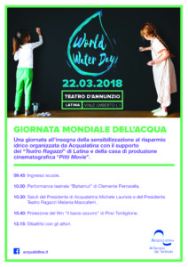 Ricorre oggi la Giornata Mondiale dell’Acqua, istituita nel 1992 dall’ONU per accrescere la sensibilizzazione nei confronti delle risorse idriche. Acqualatina, gestore del servizio idrico integrato nell’Ato4-Lazio Meridionale, da sempre celebra questa importante ricorrenza con attività volte all’eduzione e alla sensibilizzazione dei più piccoli, prediligendo l’educazione a eventi di stampo tecnico, grazie alla collaborazione continuativa che la Società porta avanti da 12 anni con le scuole del territorio. Negli anni, Acqualatina ha permesso ai più piccoli di entrare in contatto con il mondo del servizio idrico e della natura grazie a visite guidate presso i propri impianti e presso i meravigliosi Giardini di Ninfa, definiti dal “New York Times” tra i più belli al mondo. Quest’anno, invece, è l’arte a veicolare i valori di tutela e rispetto delle risorse idriche. Grazie alla rinnovata collaborazione con l’Associazione “Teatro Ragazzi” di Latina e con la casa di produzione cinematografica “PittiMovie”, infatti, il gestore offrirà, ai piccoli studenti delle scuole primarie del territorio vincitori delle edizioni del concorso “Disegna il risparmio idrico”, un’intera mattinata all’insegna dello spettacolo. Il Teatro D’Annunzio di Latina ospiterà, così, dapprima lo spettacolo teatrale “Bahamut”, scritto e diretto dall’attore e regista Clemente Pernarella, sul tema dell’importanza dell’acqua, e poi si trasformerà in cinema, per la proiezione del film sulla tutela delle risorse idriche, diretto da Pino Tordiglione, “Il bacio azzurro”, che vede, tra i protagonisti, Sebastiano Somma, Claudio Lippi e Remo Girone. Al termine, Acqualatina ha riservato, agli studenti, la possibilità di discutere dal vivo direttamente con Clemente Pernarella e con gli attori del film. Gadget e volantini riportanti i buoni consigli per una corretta gestione e un rispetto delle risorse idriche non potranno certo mancare, come nella migliore tradizione di Acqualatina.