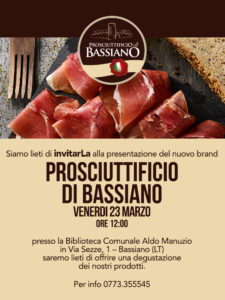 Venerdì 23 Marzo alle ore 12:00 presso la Biblioteca Comunale Aldo Manuzio, il Prosciuttificio di Bassiano s.r.l. presenterà il suo nuovo Brand, cogliendo l’occasione si potrà degustare