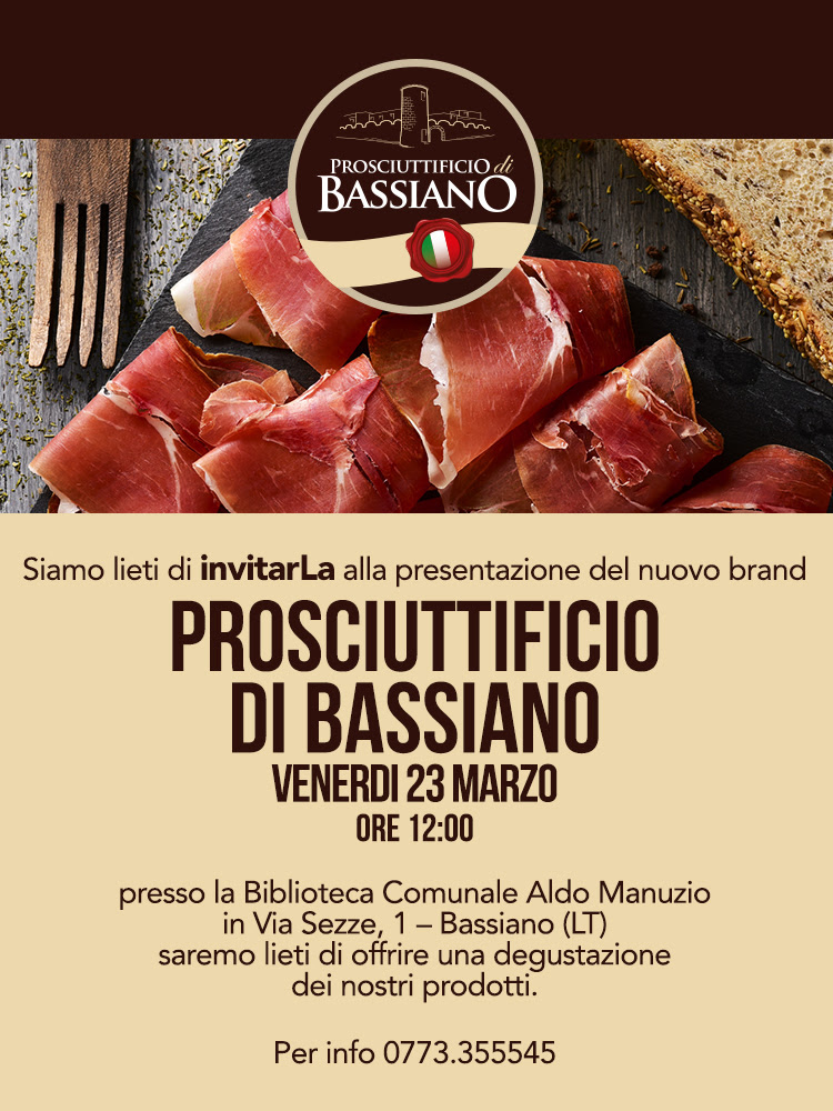 Venerdì 23 Marzo alle ore 12:00 presso la Biblioteca Comunale Aldo Manuzio, il Prosciuttificio di Bassiano s.r.l. presenterà il suo nuovo Brand, cogliendo l’occasione si potrà degustare