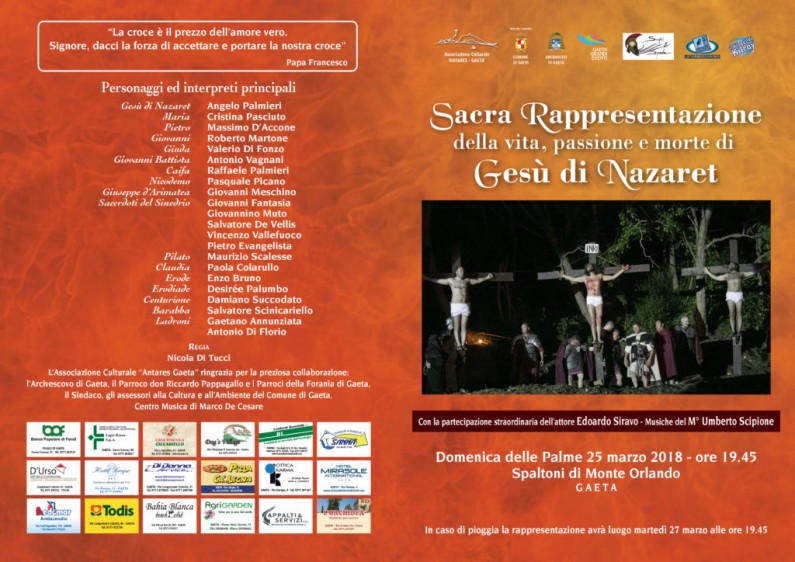 Domenica 25 Marzo 2018 alle ore 19.45, ritornano a Gaeta le emozioni della Sacra Rappresentazione della Passione di Nostro Signore Gesù Cristo, portata in scena nella suggestiva area degli Spaltoni a Monte Orlando dagli attori dell’Associazione Culturale Antares Gaeta, coadiuvata dall’Associazione Sogni e Spade, realizzata in collaborazione con il Comune e con il patrocinio dell’Arcidiocesi di Gaeta e della Regione Lazio. Radio Spazio Blu media partner. E’ la rievocazione storica di uno dei momenti più forti dell’Anno Liturgico, ormai una tradizione popolare, tra le più attese dalla cittadinanza e dai turisti, ogni anno presenti in gran numero a conferma dell’ultradecennale successo dell’evento. Sotto l’accurata regia del Prof. Nicolino Di Tucci, gli attori ricostruiranno il percorso doloroso di Gesù, in un contesto naturale dal forte impatto scenico. Anche quest’anno un’edizione speciale che vedrà la partecipazione dell’attore Edoardo Siravo e sarà impreziosita dalle musiche del Maestro Umberto Scipione alle quali è affidato il compito di aiutare a definire ed affermare l’identità stessa della rievocazione, che acquisterà con le sue note pathos e forza emotiva. Per il Sindaco Cosmo Mitrano “La città di Gaeta ospita la rievocazione della Sacra Rappresentazione in un contesto naturale, vero, fatto di penombra, di buio, quasi sacro nel quale alcuni accorgimenti teatrali sanno creare quella suggestiva armonia di colori, luci e suoni che coinvolgono e stupiscono lo spettatore. Scenografie, colonna musicale, costumi, armamenti: tutto è realizzato dai soci dell’Associazione Antares con la preziosa collaborazione dell’Associazione Sogni e Spade. Una ricostruzione fedelissima che riporta indietro nel tempo e trasforma l’area degli Spaltoni in una piccola Gerulasemme. Un ringraziamento sentito rivolgo al Prof. Di Tucci, vera anima della Sacra Rappresentazione oltre che regista, ed a tutti coloro che, nei diversi ruoli e con le diverse competenze, nel corso di questi anni hanno reso, ed ancora oggi rendono, questa manifestazione una grande tradizione popolare, un evento unico nel nostro comprensorio. Un grazie sincero al Maestro Umberto Scipione, nostro illustre concittadino e grande compositore di fama internazionale che risponde sempre con grande entusiasmo e passione agli appelli della sua terra”. Il Presidente Di Tucci sottolinea il grande lavoro sul palcoscenico e dietro le quinte di tutti i collaboratori: “E’ un grande impegno che i partecipanti si assumono in modo del tutto volontario e con il desiderio di vivere uno dei momenti più forti dell’anno liturgico in modo ancora più intenso, più profondo. Con questo spirito ogni anno si affrontano l’organizzazione generale, il progetto scenografico, la confezione dei costumi, l’allestimento delle scene la scuola di recitazione. Tutti gli attori giovani e meno giovani sono dilettanti, ma si esibiscono con il massimo impegno. La nostra Associazione vuole contribuire a meditare i misteri che accompagnarono la passione e morte di Gesù di Nazareth attraverso una rappresentazione teatrale che sappia parlare al cuore del pubblico rinnovando sempre forti emozioni”. L’appuntamento è per il 25 marzo 2018, Domenica delle Palme, alle ore 19:45, presso gli Spaltoni – Monte Orlando. In caso di pioggia la rappresentazione avrà luogo martedì 27 marzo sempre alle ore 19:45.