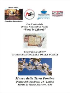 Si ritrovano i poeti del nostro territorio, per la 18ª edizione della Giornata Mondiale della Poesia, in programma a Latina Sabato 24 marzo alle 16.00 nella sala conferenze del Museo della Terra in piazza Quadrato. L’evento ad ingresso libero è promosso e organizzato dal Premio Nazionale di Poesia Versi in Libertà con la collaborazione di ARTE, Associazione Ricerca Territorio Educativo e l’Associazione Culturale Pontina. L’incontro prenderà il via con una speciale visita guidata del Museo della Terra e dopo i saluti del presidente del Premio Nazionale di Poesia Versi in Libertà Angelo D’Onofrio, tutti i poeti pontini e lepini che hanno aderito alla manifestazione declameranno le loro poesie, in vernacolo e in Italiano. La giornata della poesia, voluta dall’Unesco 19 anni fa, si celebra in tutto il mondo ogni anno il primo giorno di primavera ed è stata istituita in quanto l’Unesco riconosce all’espressione poetica un ruolo privilegiato della promozione del dialogo interculturale, della comunicazione e della pace. I poeti pontini e lepini attraverso le loro opere racconteranno uno spaccato di vita vissuta e sottolineeranno con sfumature sottili la storia e le tradizioni che distinguono il nostro eterogeneo territorio.