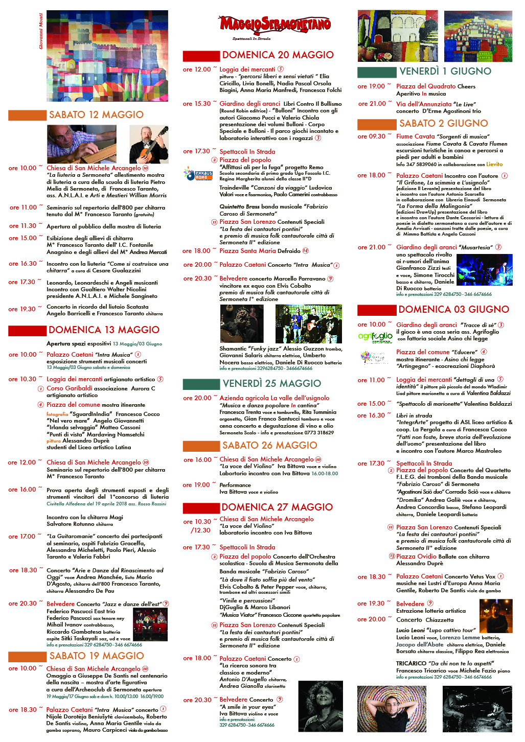 Prende il via a partire da oggi il “Maggio Sermonetano”, la manifestazione che da 23 anni anima le strade e le piazze del Comune di Sermoneta. La manifestazione che si svolgerà nei fine settimana da oggi fino al 3 giugno è a cura dell’Associazione Suono Parola Immagine, con direzione artistica e organizzazione curata da Massimo Gentile, Guido Di Falco e Francesco Monti, con il contributo e il patrocinio del Comune di Sermoneta e il sostegno della Fondazione Caetani e della Pro Loco di Sermoneta. Un appuntamento con la cultura, l’arte e lo spettacolo con una serie di eventi dove non mancheranno anche artisti di fama internazionale. Questa edizione del festival sarà dedicata a Giovanni Monti, artista e artigiano di Sermoneta che per diversi anni ha collaborato con l’Associazione Suono Parola Immagine, venuto a mancare pochi giorni fa. In basso la foto con il programma completo della manifestazione.
