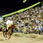 Porta Signina vince il Palio Madonna del Soccorso 2018. Tenendosi incollati ai rivali di Porta Ninfina, costantemente avanti seppur di poco, i quattro cavalieri gialloverdi (Oreste Agnoni, Luigi Macale, Emanuele Carpineti, Luigi Paolo Zampini) hanno interrotto il digiuno in corso da qualche anno riportando la vittoria alla loro contrada e conquistando il palio realizzato dall’artista Alessio Pistilli, omaggio al professore Francesco Porcari, scomparso lo scorso novembre. Il risultato finale ha dunque visto Porta Signina a 10 anellli, Porta Ninfina 9 e Porta Romana 4. Prima della disputa del torneo il corteo in abiti rinascimentali ha percorso il centro storico della città partendo da piazza Signina e arrivando al campo di gara di Stoza. Premiati dal Sindaco Mauro De Lillis, dall’Assessore alla Cultura Paolo Fantini e dal Presidente dell’Ente Carosello, Maria Teresa Luciani, i vincitori del concorso “Cori – Strade, piazzette e vicoli in fiore”: 1° classificato – comitato di quartiere di via della Repubblica, 2° classificato – Raffaella De Cave, 3° classificato – Rosaria Ducci. Si conclude così con tantissime presenze questa edizione del Carosello, soddisfatto il Sindaco Mauro De Lillis che plaude alla manifestazione e ai volontari: “Cori città del Carosello Storico dei Rioni. Lo abbiamo visto ieri sera e nelle settimane precedenti. Questo è sì un evento culturale di rilievo, ma soprattutto una tradizione profondamente sentita dai coresi. È infatti una città intera che si identifica con il Carosello Storico: Cori È anche il Carosello. E ciò che più di ogni altra cosa lo contraddistingue è che riesce a unire storia, cultura, arte e popolo. Perché il Carosello Storico è una festa di popolo e per il popolo. Lo dimostra il fatto che non solo arriva a raccogliere più di 4.000 persone paganti in due appuntamenti, ma è in grado di coinvolgere tanti volontari di tutte le età. Ieri sera –aggiunge il primo cittadino – abbiamo chiuso l’edizione 2018 con un bilancio assolutamente positivo, forte di una grande partecipazione. Non è mancato l’omaggio a un grande artista, un pezzo della storia culturale di questa città e della storia dello stesso Carosello: Francesco Porcari. Doverosi infine i ringraziamenti a chi ha permesso tutto questo: l’Ente Carosello, il suo presidente Maria Teresa Luciani, i comitati di Porta, i figuranti, i cavalieri, gli sbandieratori e tutti i volontari. Voglio ringraziare chi ha cucinato, chi ha servito ai tavoli delle taverne, chi ha messo a disposizione il suo tempo e la sua fatica per montare le porte e che lo farà di nuovo per smontarle, chi ha caricato, scaricato, chi ha organizzato i giochi popolari, chi si è occupato dei costumi, delle acconciature e di ogni dettaglio, chi ha collaborato nei vari modi in cui ha potuto. Grazie ragazzi. Il Carosello è vostro”.