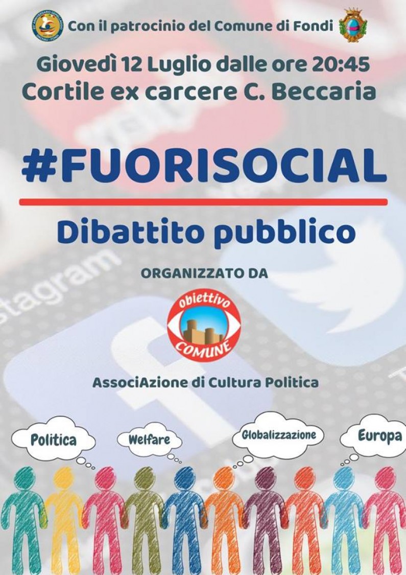 L’AssociAzione di Cultura Politica Obiettivo Comune organizza il dibattito pubblico #FUORISOCIAL. L’evento, patrocinato dal Comune di Fondi si svolgerà giovedì 12 luglio, a partire dalle ore 20:45 presso l’ex carcere Cesare Beccaria. In un tempo nel quale il confronto su tematiche politiche è demandato solo ai social network, Obiettivo Comune ritiene opportuno riportarlo in un luogo pubblico. Per questo, ha deciso di organizzare un dibattito su tematiche di spessore politico e sociale, lontano dai confini dei partiti e dai nickname di un account social. Un dibattito che mette in campo temi, idee, proposte e riflessioni, consapevoli che in politica, come nella vita, non esistono verità e che il confronto è una chiave di crescita personale e sociale. Un dibattito che per essere partecipato non può che essere regolato da qualche norma che ne definisca i limiti e i tempi di dialogo, il tutto in un clima informale tra persone di qualunque estrazione politica e sociale, che sentano il bisogno di doversi confrontare e di farlo senza il timore di essere additati o il preconcetto di essere giudicati. Tutto con il massimo rispetto reciproco e nello stile sancito dai diritti e doveri del cittadino, inscritti nei Principi Fondamentali e nella Parte Prima della Costituzione della Repubblica Italiana. Tre i principali temi che verranno affrontati nel corso del dibattito: Quali sfide per il walfare all’italiana: Reddito di cittadinanza, Flat tax, piena occupazione e i numeri che non tornano mai; Eur-opa – l’Unione mai così divisa: L’euroscetticismo sarà la chiave per una revisione della moneta e delle politiche comunitarie o segnerà la fine del sogno di Ventotene?; Ideologie e realpolitik, imperialismo e società delle nazioni, globalizzazione e protezionismo: Verso quale visione del mondo?.