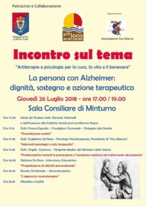 L’Associazione “Vox Alterna”, con il patrocinio del Comune di Minturno e della locale Pro Loco, ha organizzato, giovedì 26 luglio alle ore 17:00, l’incontro dal titolo: “La persona con Alzheimer: dignità, sostegno e azione terapeutica”. L’evento, che si svolgerà presso la Sala Consiliare del Comune di Minturno, intende focalizzare l’attenzione sul trattamento delle persone affette dal morbo di Alzheimer attraverso l’azione dell’arteterapia. Relatori dell’incontro saranno: il dott. Guglielmo De Rosa, psicologo, psicoterapeuta e presidente dell’associazione “Vox Alterna”; il dott. Virgilio Costanzo, dirigente medico del Ministero della Salute; Giuliana De Rosa, infermiera ed educatrice; Renato De Michele, musicoterapista. L’incontro sarà aperto dal sindaco di Minturno, dott. Gerardo Stefanelli, dall’assessore alle Politiche Sociali, prof.ssa Mimma Nuzzo e dal dott. Franco Esposito, consigliere comunale e delegato alla sanità del Comune di Minturno.