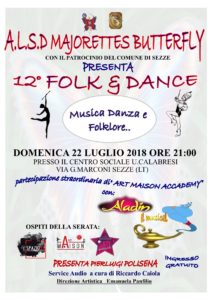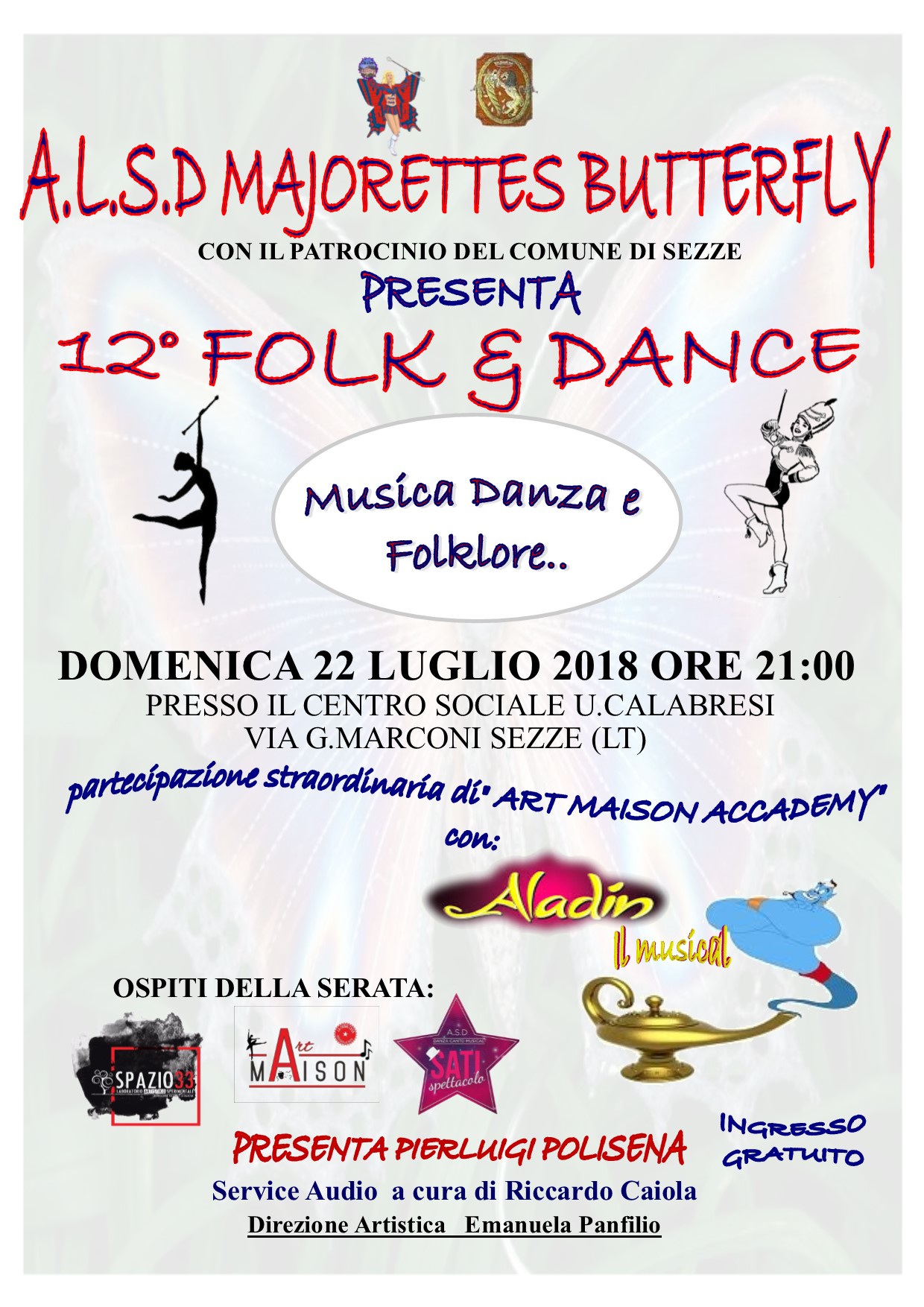 Domenica 22 Luglio 2018 ore 21.00 presso il Centro Sociale U. Calabresi, l’Associazione Butterfly, primo gruppo storico di majorettes nato nella Città di Sezze nel 2004, presenta la 12° edizione dello spettacolo evento ‘’Folk & Dance’’. Spettacolo ad ingresso gratuito dedicato alla musica, danza e folklore. Il gruppo è cresciuto negli anni formandosi nelle varie discipline di majorettes e twirling, si esibisce in tutto il territorio Nazionale e nel 2014 entra nel mondo dell’agonismo, partecipando ai “Campionati Italiani di Majorettes e Twirling” e portando il nome di Sezze sul gradino più alto del Podio. Sotto la guida di Emanuela Panfilio insegnante e tecnico federale N.B.T.A. ITALIA, le allieve in questa edizione si esibiranno nelle loro performance di squadra e nella nuova disciplina Accessori Dance, solo e duo. Per questa edizione le Majorettes Butterfly hanno ben pensato di inserire molte novità, una di queste sarà l’intervento dell’Art Maison Accademy di Piero Zinna con il musical ‘’La leggenda di Aladdin’’. Ospiti della serata: Spazio 33-Laboratorio Artistico Sperimentale nel campo della danza e Ranjita Mancini di Sabaudia per il canto.