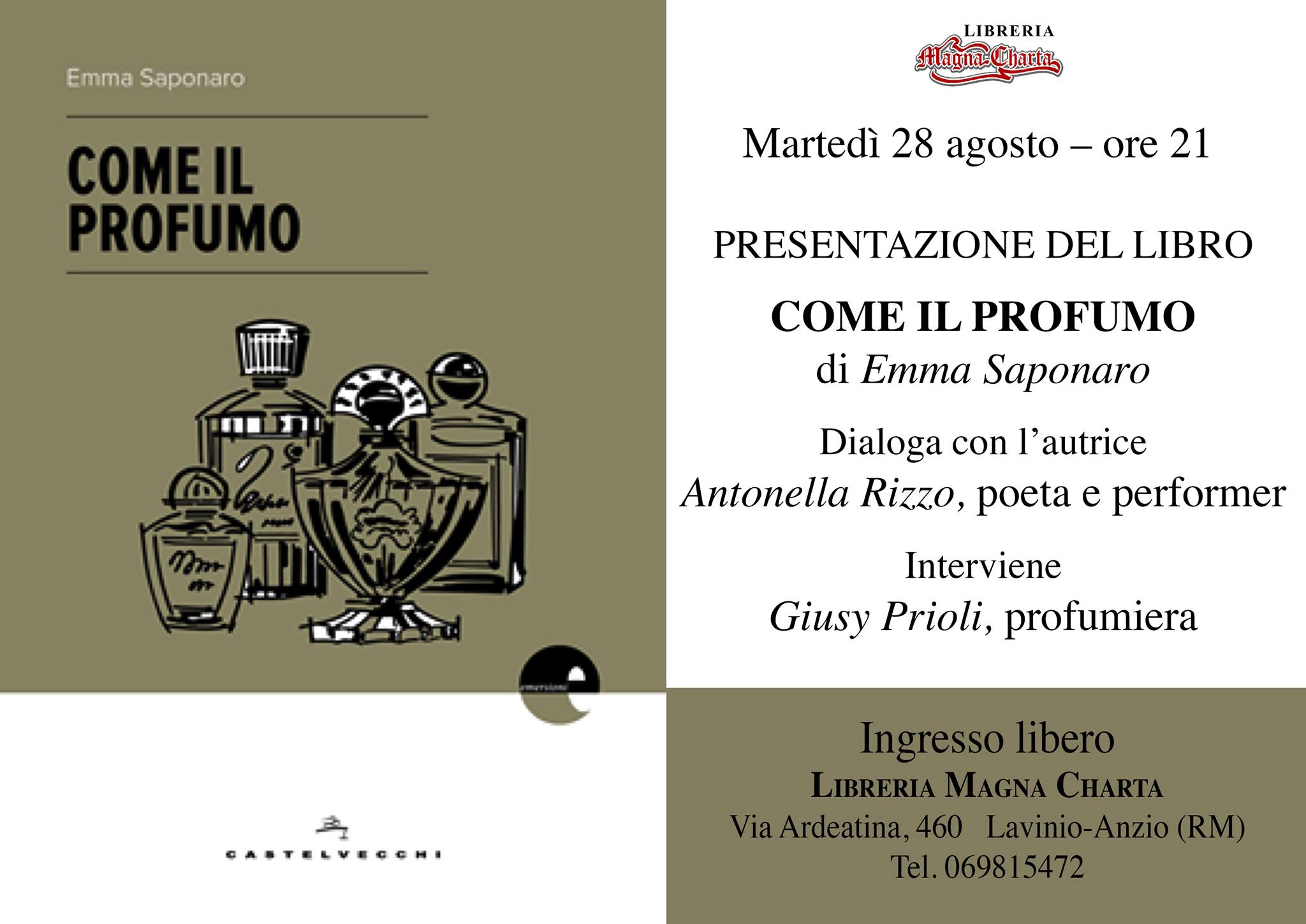 Emma Saponaro con il suo romanzo Come il profumo (Castelvecchi) sarà ospite della libreria Magna Charta di Lavinio-Anzio martedì 28 agosto, ore 21. Dialogherà con la scrittrice Antonella Rizzo, poeta e giornalista. Giusy Prioli, profumiera, indagherà i rapporti fra scrittura e profumi.