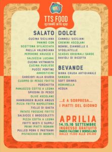 In anteprima il Menù del Festival dello Street Food e Artigianato che si terrà ad Aprilia il 14, 15 e 16 settembre presso il parco comunale Falcone e Borsellino di via dei Mille. Menù: Panino con scottona sfilacciata, cucina siciliana e paella valenciana. Peperone krusco e salciccia lucana. Cucina vietnamita, pugliese e pucce pontine. Arrosticini, carciofi alla giudia, cuoppo di pesce fritto e porchetta. Panuozzo cotto a legna, spiedini di pesce, olive ascolane, hamburger black angus e pizza fritta napoletana. Tielle di Gaeta, patate fresche fritte, salsicce e broccoletti, pizza cotta a legna, fritti misti e supplì vari gusti. Primi piatti della cucina romana, pulled porke pastrami, pistacchio di bronte. Dessert: cannoli siciliani, cremini ascolani, bombe ciambelle e sfogliatelle. Seadas originali sarde e ravioli di ricotta. Bevande: birra cruda artigianale, sangria, soft drink, romanella e acqua. Inoltre ogni giorno il Menù verrà arricchito con piatti a sorpresa. Il Menù, curato dalla Ttsfood, verrà preparato da 25 street chef “On The Road” appositamente selezionati per la tappa pontina.