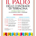 Il 25 e il 26 agosto si svolgerà a Terracina, nel Centro Storico alto, la I edizione del “Palio delle Contrade”: una rievocazione di eventi liberamente tratti dalla documentazione storica della città del periodo medievale. L’organizzazione degli eventi principali prevede quattro importanti momenti rievocativi: il “Bando Cittadino per le Contrade”; il “Giuramento delle Contrade”; il “Corteo Storico delle Contrade”; la “Disfida degli Arcieri delle Contrade”. Agli eventi principali seguiranno, per ogni giornata, una serie di manifestazioni collegate: l’esibizione del “Gruppo degli Sbandieratori” a Piazza Municipio; l’iniziativa denominata “Taverne, Locande e Osterie del Palio delle Contrade”, con offerta enogastronomica di cucina medievale e prodotti tipici nei locali del Centro Storico alto e nel “Punto Ristoro di Piazza Assorati”; l’esposizione di artigianato e antichi mestieri, degustazioni, giocolieri, musicanti, sputafuoco, cantastorie, giullari, canti e balli popolari e altro ancora nelle vie e nelle piazze del Centro Storico alto. Il momento clou del “Palio delle Contrade” si avrà domenica 26 agosto con la sfilata del “Corteo Storico” che attraverserà il centro della città da Porta Maggio a Porta Albina con epicentro a Piazza Municipio, davanti alla Cattedrale, al Palazzo Vescovile e al Palazzo Comunale, dove si svolgerà la “Disfida degli Arcieri delle Contrade” e l’esibizione del “Gruppo degli Sbandieratori”. Si proseguirà con musica, degustazioni, spettacoli ed intrattenimenti vari fino a tarda notte nelle vie e nelle piazze del Centro Storico alto.